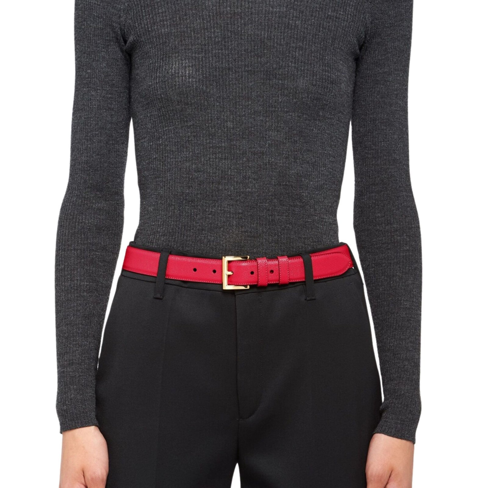 Step into sophistication with our meticulously crafted Prada Leather Belt In Red , defined by its sleek and refined design. A hallmark of our brand’s legacy, it features a metal buckle adorned with the iconic triangle logo, a symbol of our commitment to excellence.