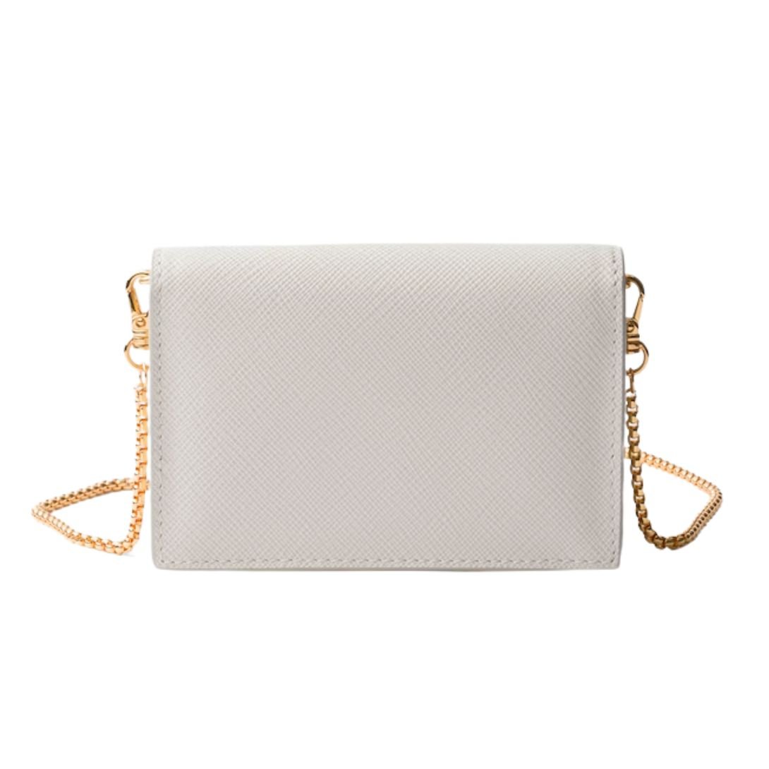 PRADA SAFFIANO LEATHER CARD HOLDER WITH SHOULDER STRAP CHALK WHITE
