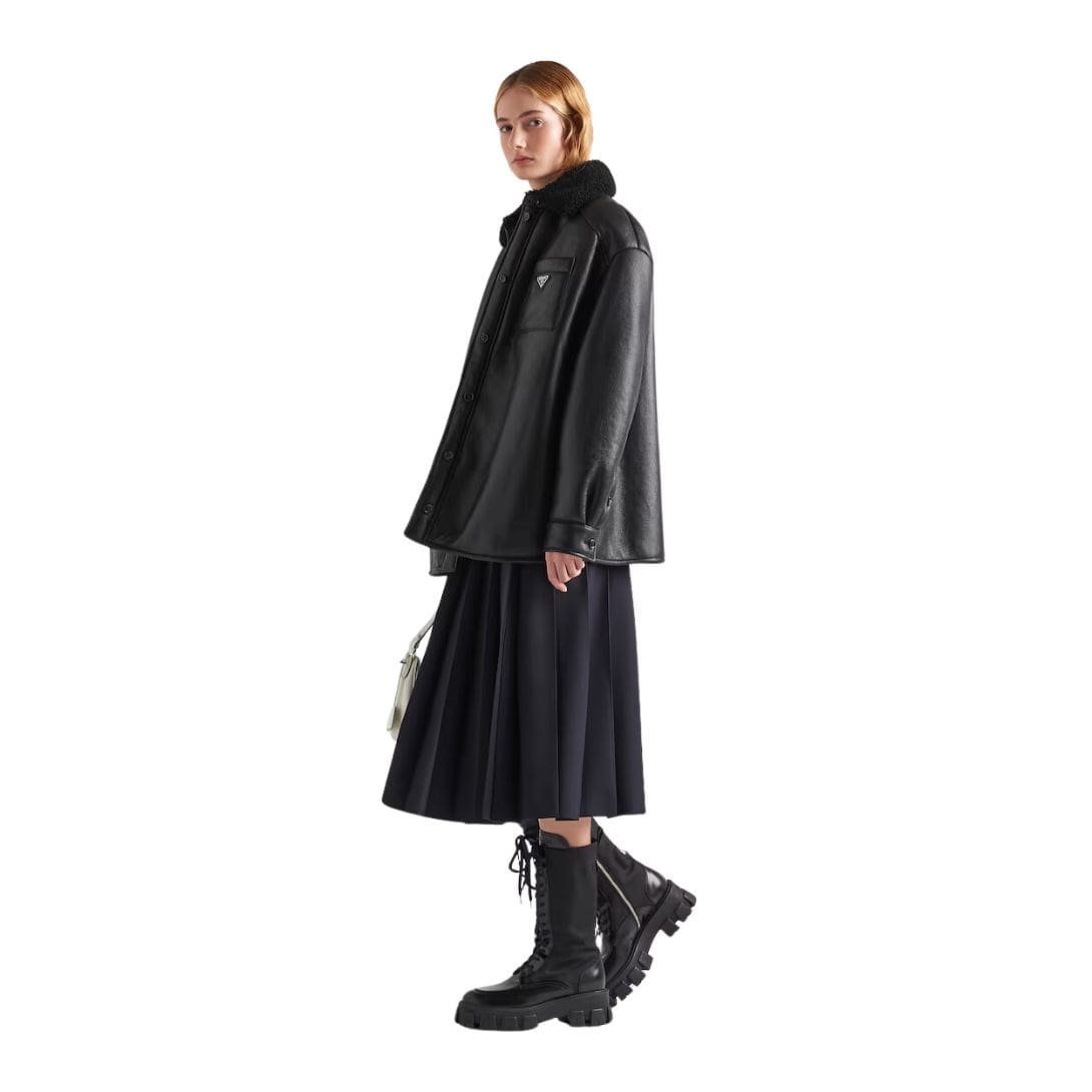 Beyond its aesthetic appeal, the Prada Shearling Jacket is designed for practicality and comfort. Thoughtful details such as adjustable cuffs and zippered pockets enhance functionality, while a plush shearling-lined interior provides supreme warmth and insulation. The jacket strikes the perfect balance between fashion and function, offering both style and substance to the discerning wearer.