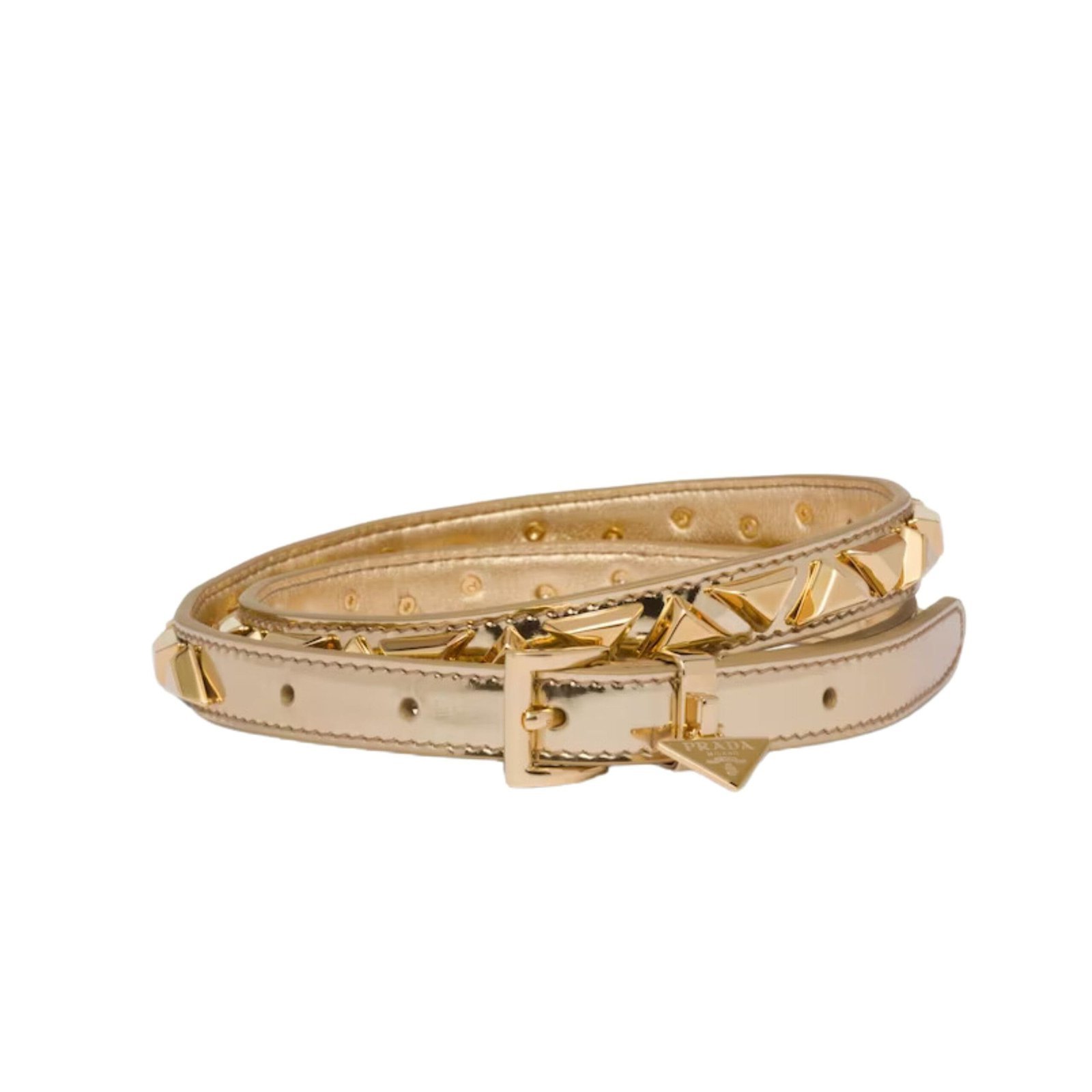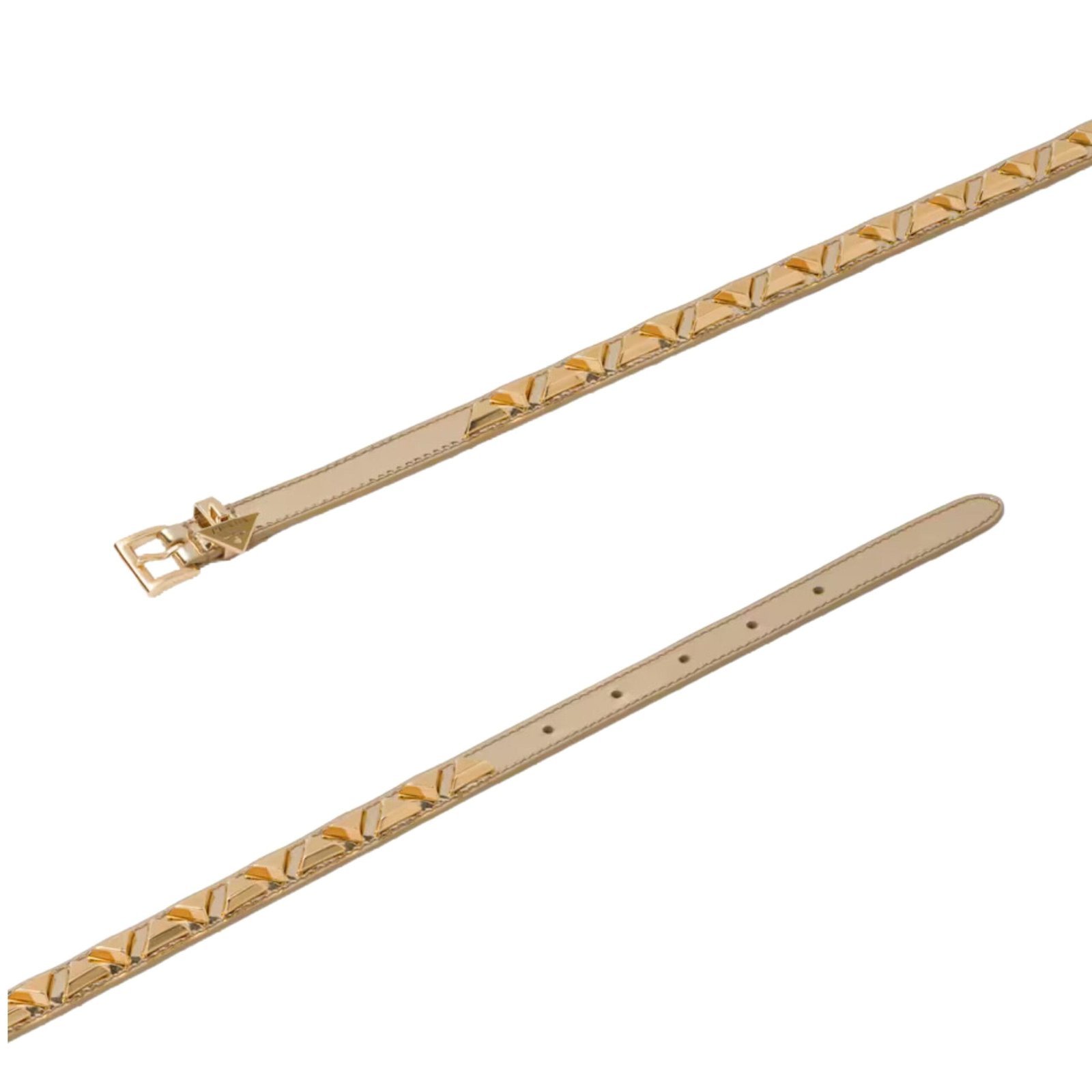 Experience the epitome of elegance with our brushed Prada Studded Brushed Leather Belt, distinguished by the captivating enameled metal triangle logo charm, exuding sophistication with a bold and feminine touch. This accessory stands out with its daring design, elevated further by precious studs that infuse a contemporary edge.
