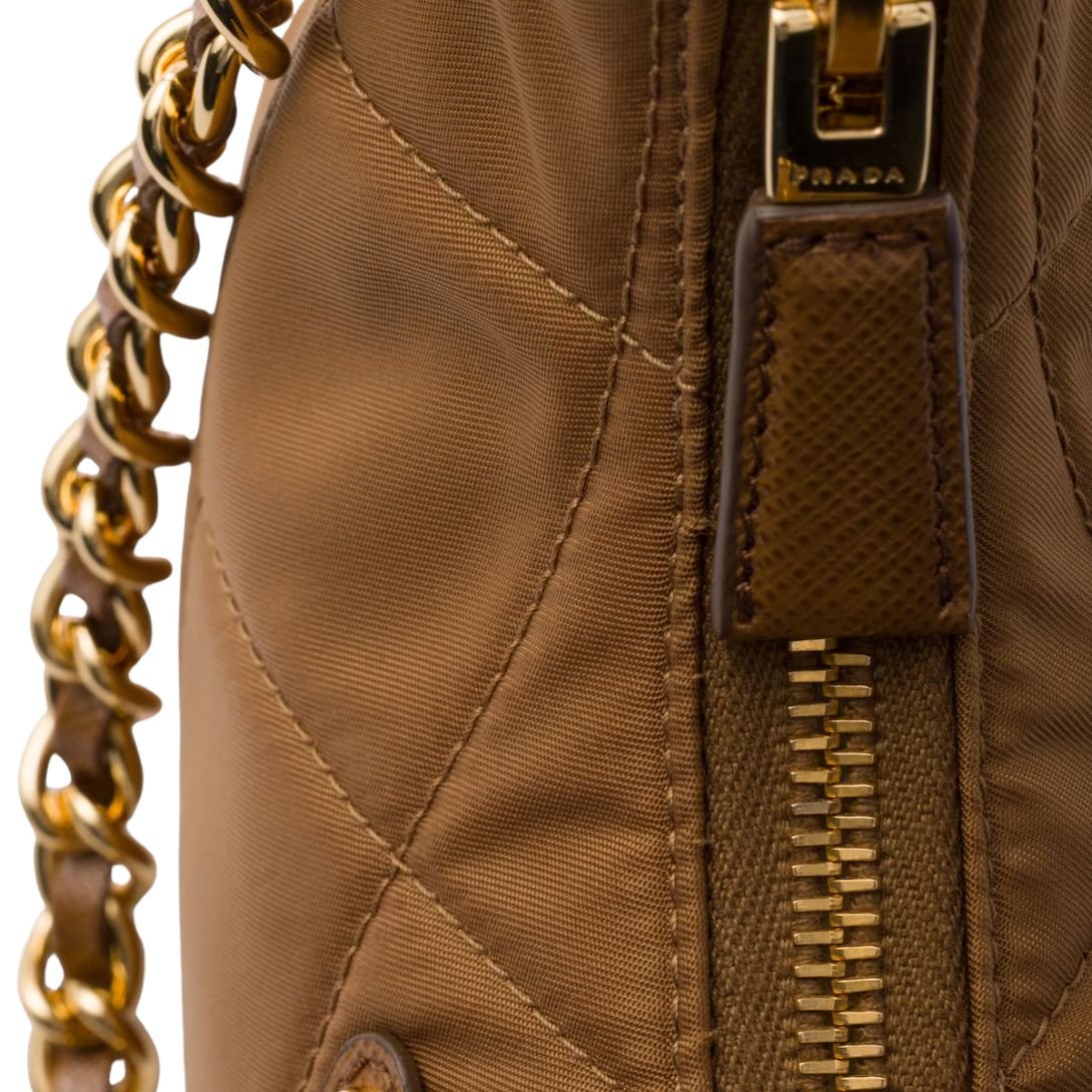 A leather-threaded chain handle adds a refined edge, complemented by sleek metal hardware and the signature enameled triangle logo on the front. Thoughtfully designed for everyday elegance, the bag also features a removable leather key ring and a secure zipper closure, with an interior lined in logo-print Re-Nylon.