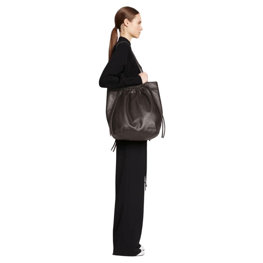 Indulge in luxury with the exquisite Proenza Drawstring Tote Dark Chocolate Bag, meticulously crafted from premium smooth leather to exude sophistication and effortless charm. Its soft, slouchy silhouette adds a touch of relaxed elegance to any ensemble, making it the perfect accessory for both casual outings and formal occasions.