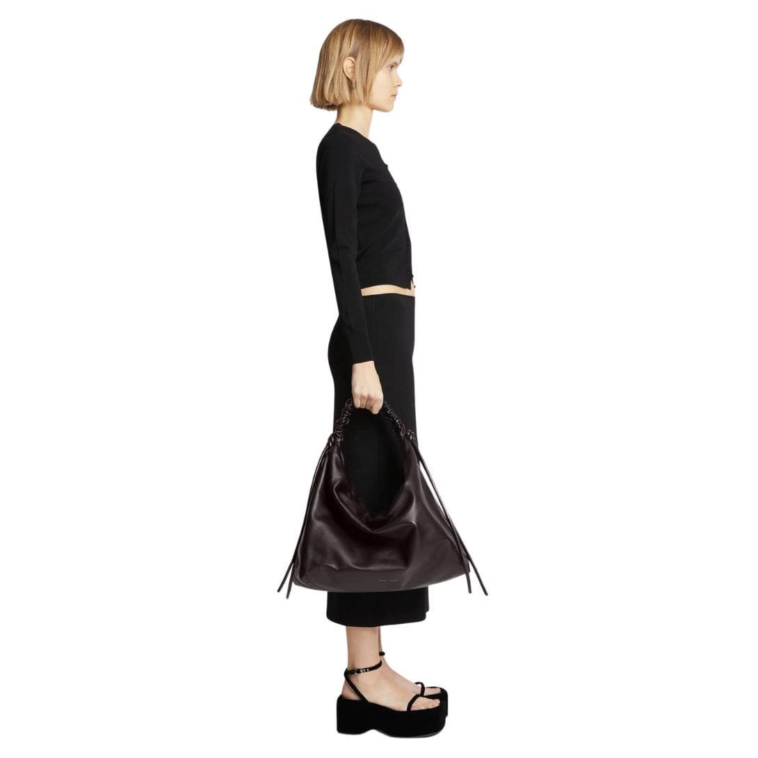 Elevate your style with the exquisite Proenza Large Drawstring Shoulder Bag Black, meticulously crafted from premium smooth leather to exude sophistication and timeless allure. Designed to make a statement with its oversized, slouchy silhouette, this bag combines luxurious craftsmanship with effortless elegance for a truly remarkable accessory.