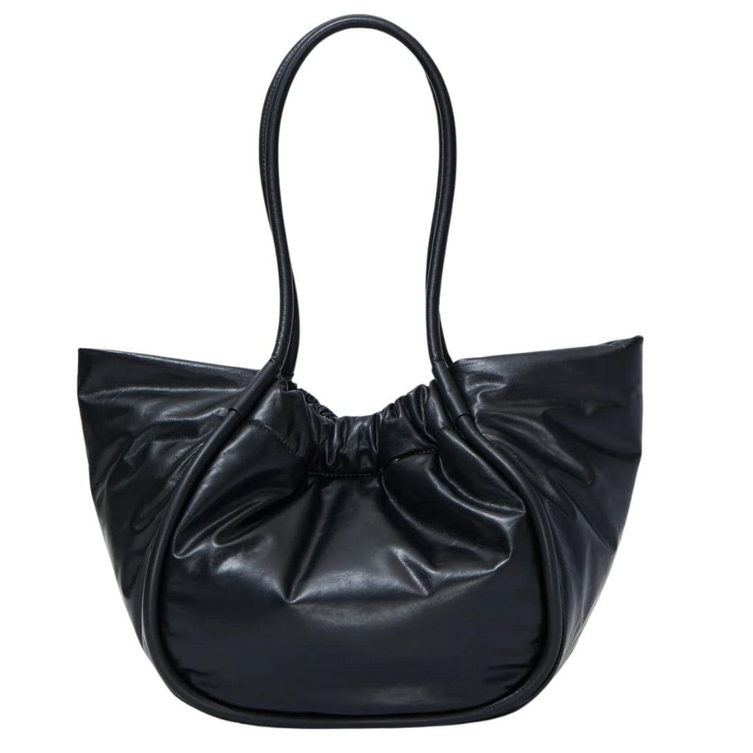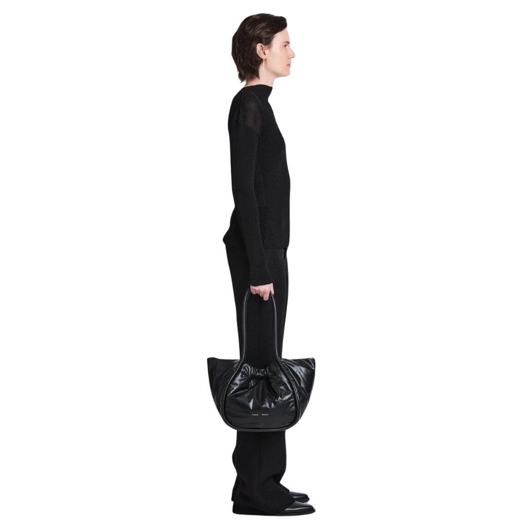 The defining feature of the Large Ruched Tote lies in its sculptural silhouette, characterized by wide piping that sweeps up to a ruched open top. This innovative design detail not only adds visual interest but also showcases the meticulous craftsmanship and attention to detail synonymous with the Proenza brand.