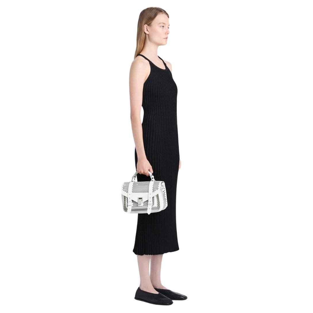 Accentuating the bag’s allure is the silver-tone metal hardware, which adds a contemporary edge and complements the optic white perforated leather with a subtle shimmer. Crafted with meticulous attention to detail, the PS1 Tiny Bag epitomizes Proenza Schouler’s commitment to superior craftsmanship and quality. Made from 100% calfskin leather, it promises both durability and sophistication, making it a standout accessory for the modern fashion enthusiast.