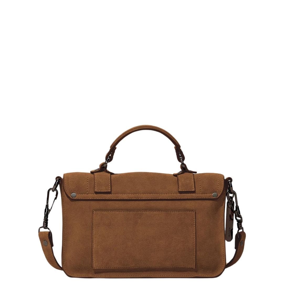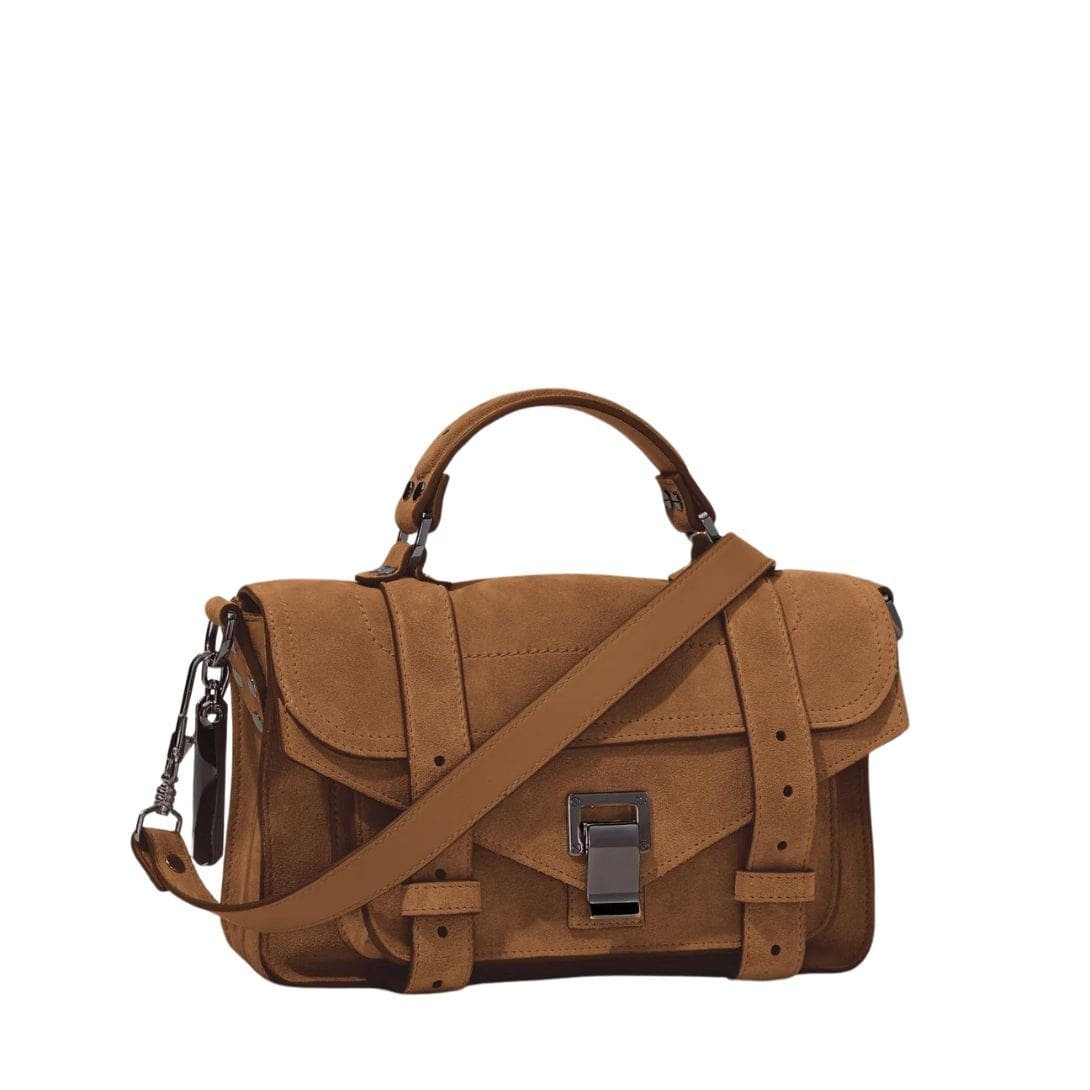 Taking inspiration from the Proenza PS1 Tiny Bag In Suede Walnut. the timeless appeal of traditional workwear satchels, the Suede PS1 Tiny Bag epitomizes a perfect blend of functionality and classic style. Crafted from luxurious suede, this iteration exudes an air of understated elegance in a rich walnut brown hue, offering versatility for any occasion.