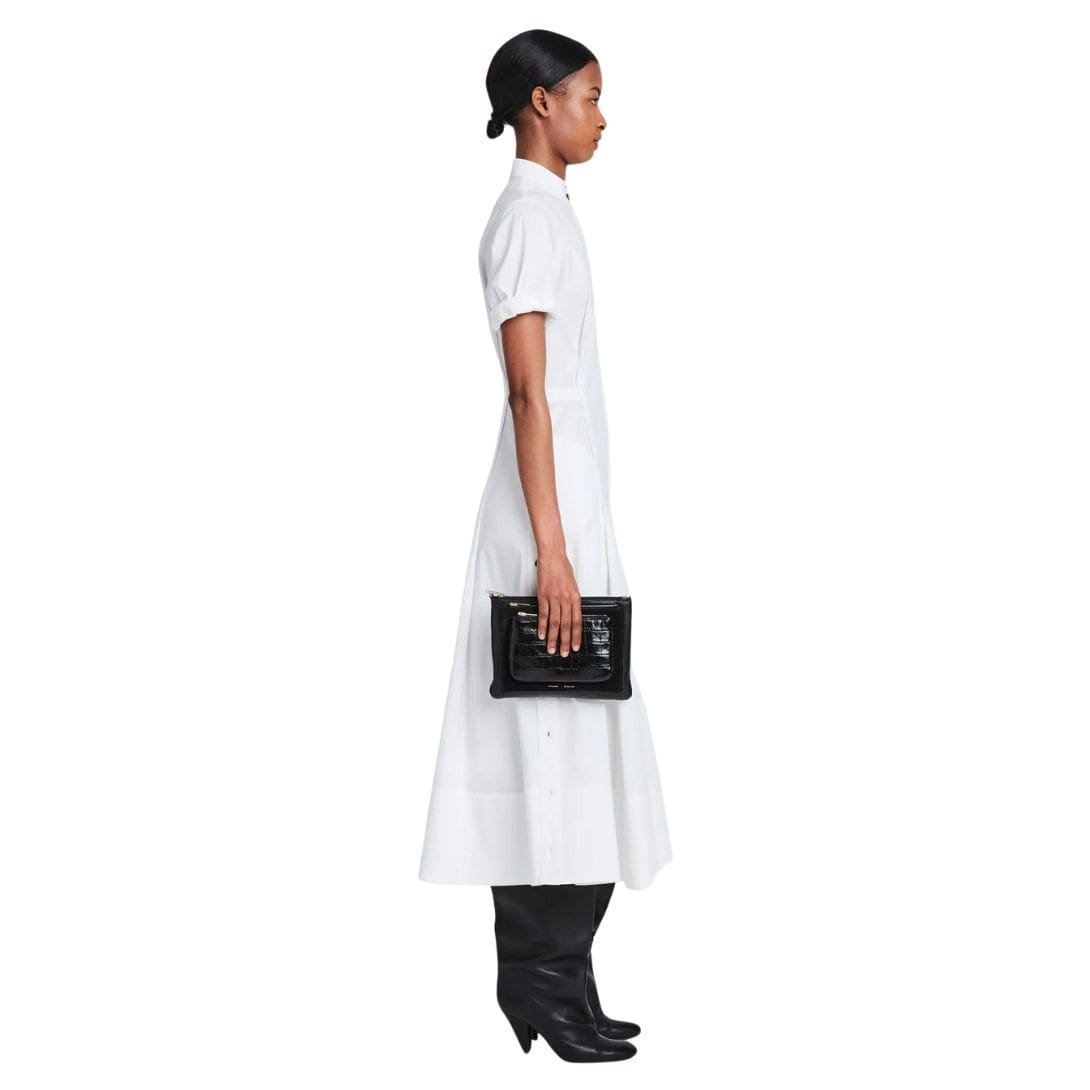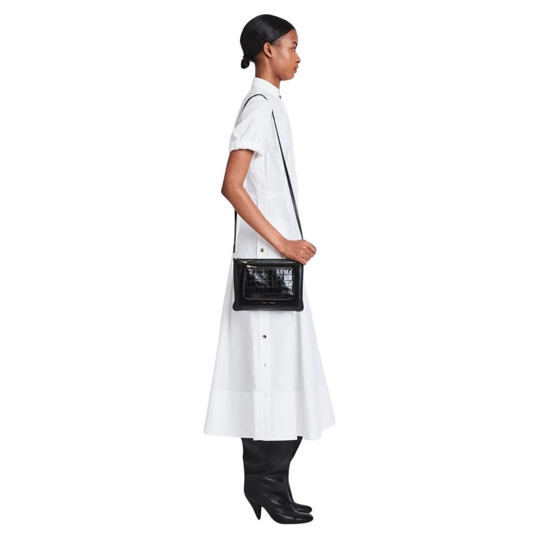 Indulge in the epitome of luxury and versatility with The Proenza Triple Zip Pouch Black, a masterful blend of smooth and croc-embossed leather coupled with supple suede. Its design is an ode to sophistication, characterized by three pouches elegantly layered in descending size order, offering both practicality and aesthetic appeal.