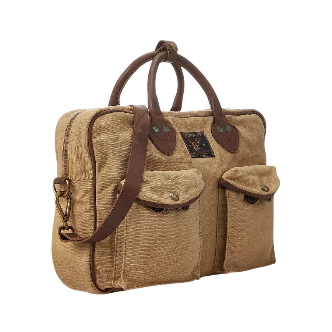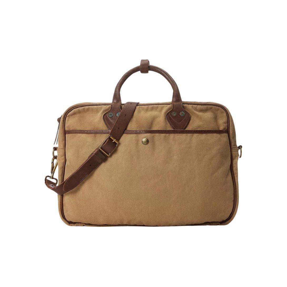 At first glance, the sleek silhouette of the briefcase exudes refinement, with its clean lines and understated elegance. The durable canvas material, meticulously chosen for its resilience and enduring quality, forms the foundation of the bag, promising longevity and reliability. This robust canvas serves as the perfect canvas for Ralph Lauren’s signature aesthetic, marrying functionality with style effortlessly.