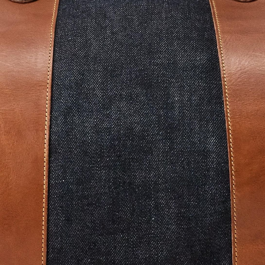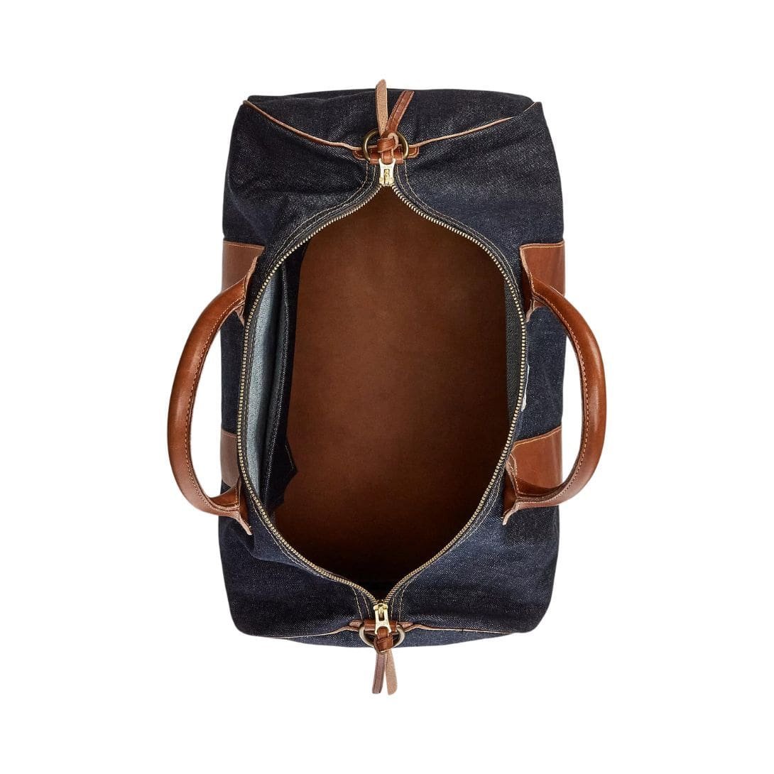 At first glance, the duffel’s exterior showcases the rugged charm of denim, a fabric renowned for its durability and versatility. The deep, indigo hue exudes a sense of classic elegance, while the subtle fading and distressing lend it a distinctive lived-in aesthetic, reminiscent of well-worn denim jeans. Reinforced with rich leather trimmings in a complementary shade, the juxtaposition of textures adds a touch of refinement and durability, ensuring that this duffel ages gracefully with time.
