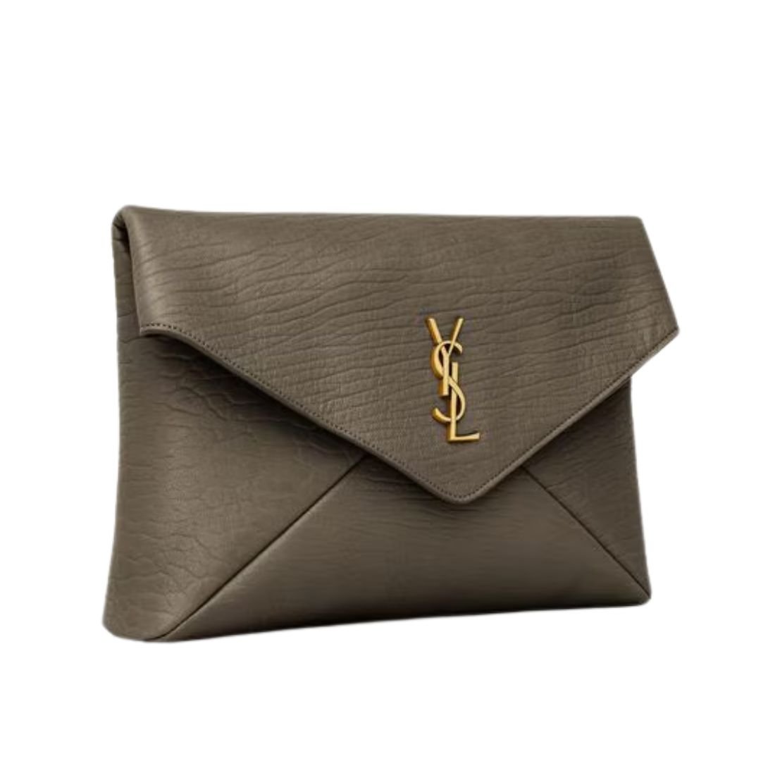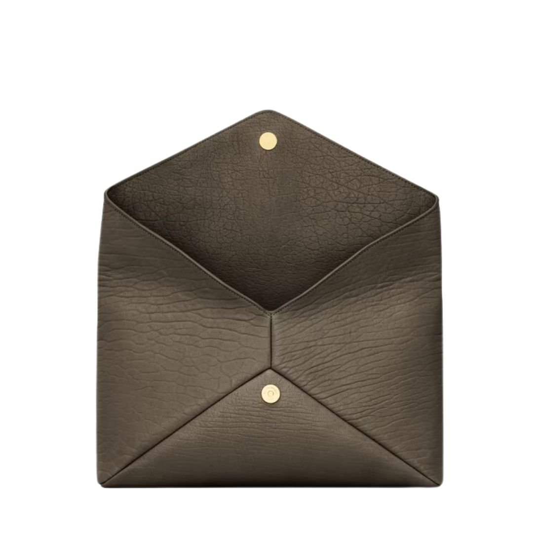 This striking large envelope pouch from Saint Laurent is defined by its sculptural origami-inspired construction and timeless silhouette. Crafted in supple lambskin, the clean lines and folded geometry offer a modern take on classic design, while the iconic bronze-toned Cassandre emblem at the flap delivers unmistakable brand heritage.