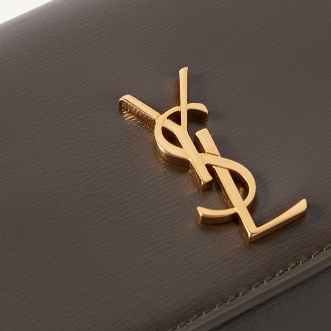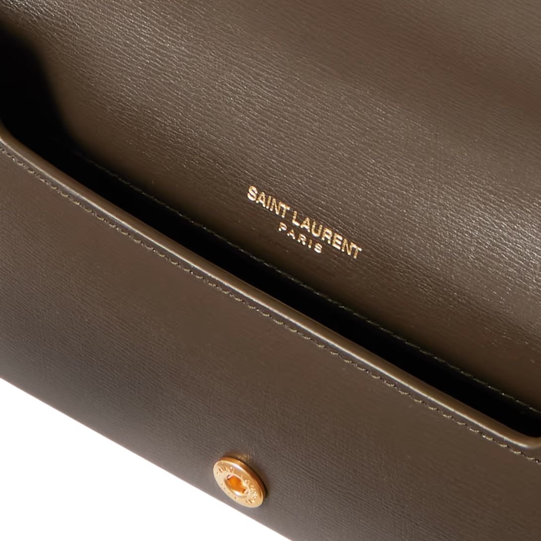 A refined essential from the iconic Cassandre collection, this Saint Laurent phone case pairs functional design with timeless sophistication. Crafted from slightly textured army-green calfskin in the shade Light Musk, it’s detailed with the signature gold-toned YSL plaque and finished with a sleek chain-trimmed shoulder strap for effortless, hands-free styling.