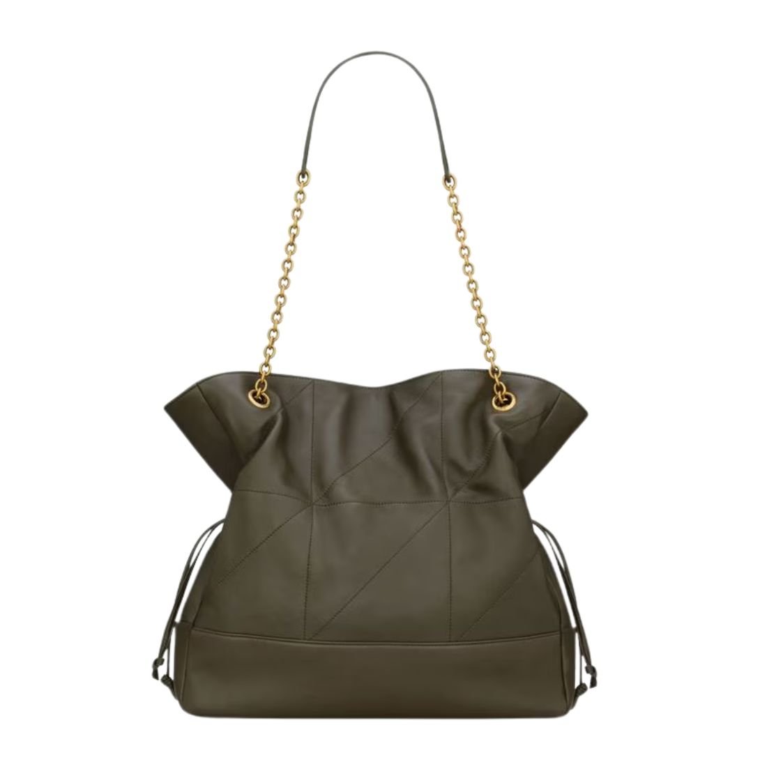 The soft structure is complemented by a removable zip pouch and interior drawstring ties with chain details, allowing the silhouette to shift between relaxed and cinched for styling flexibility. Ideal for daily essentials or travel, the Jamie offers elegant function with an edge.