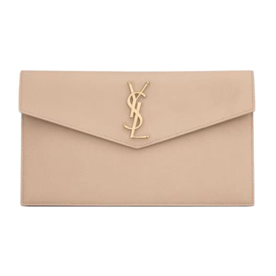 The clutch is defined by its clean envelope flap, adorned with The Cassandre—the maison’s iconic interlaced YSL logo in gold-toned metal hardware. This emblem adds a bold yet elegant touch, capturing Saint Laurent’s heritage of understated glamour.