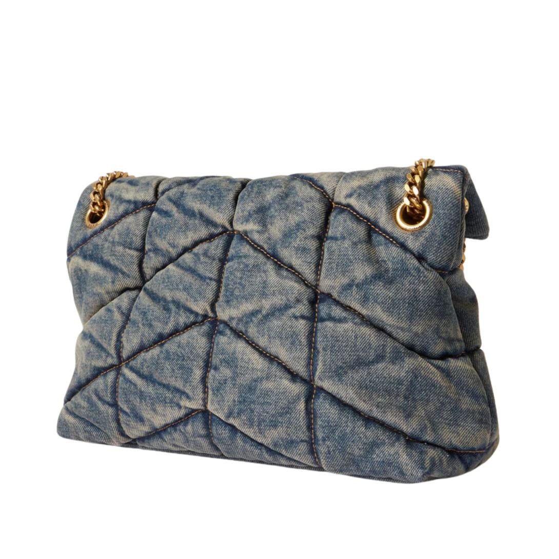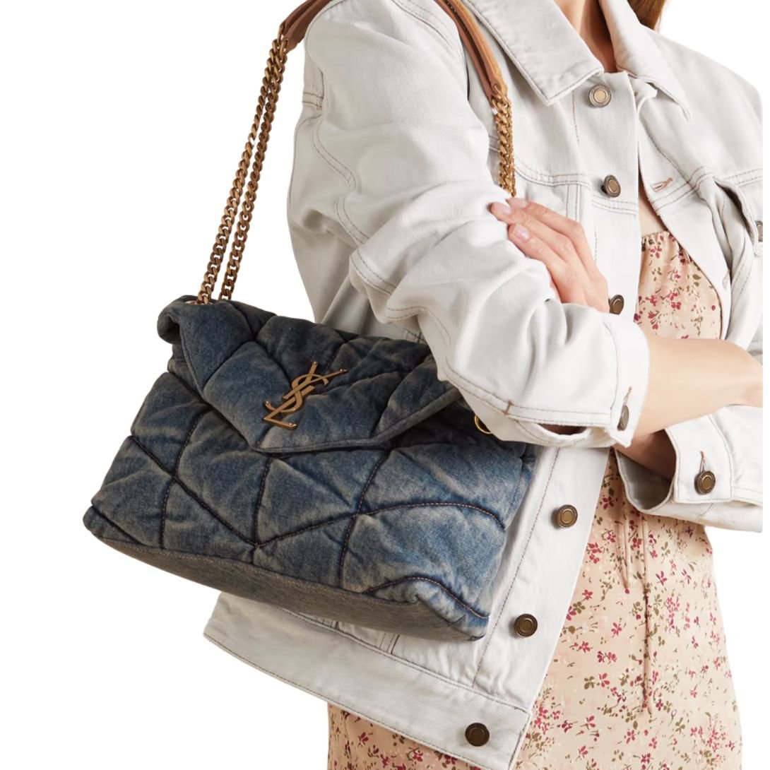 The SAINT LAURENT ‘Puffer’ shoulder bag channels unmistakable ‘90s nostalgia through its quilted tonal-blue denim construction. Sleek yet relaxed, it adds a casual-cool finish to any outfit, offering the perfect blend of retro appeal and contemporary sophistication.