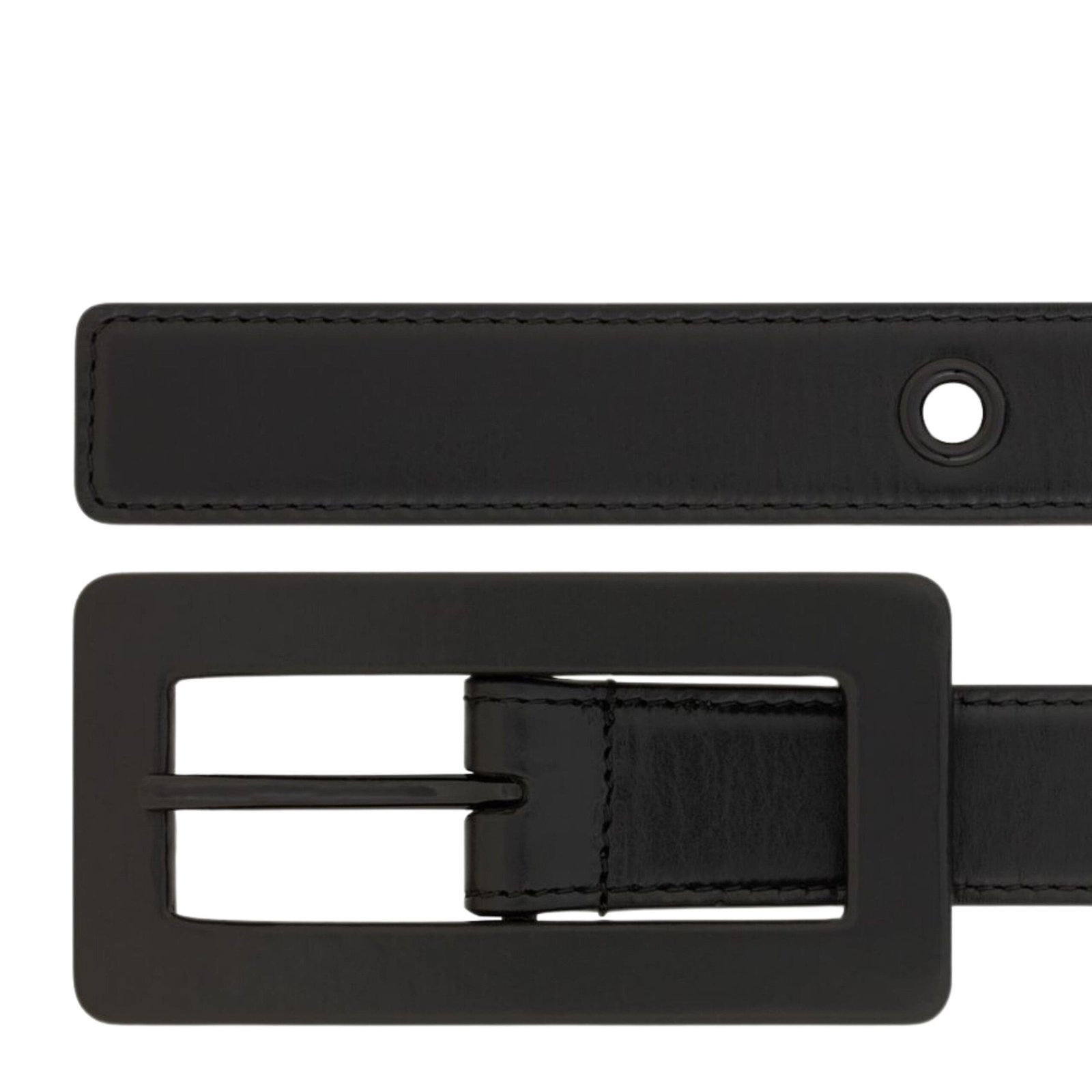 Introducing Saint Laurent Rectangular Buckle Belt In Smooth Leather crafted with an eco-conscious approach: the belt made from metal-free smooth leather, showcasing a rectangular covered buckle and a leather loop. This meticulously crafted accessory combines sustainability with sophistication, making it a versatile and stylish addition to any wardrobe.