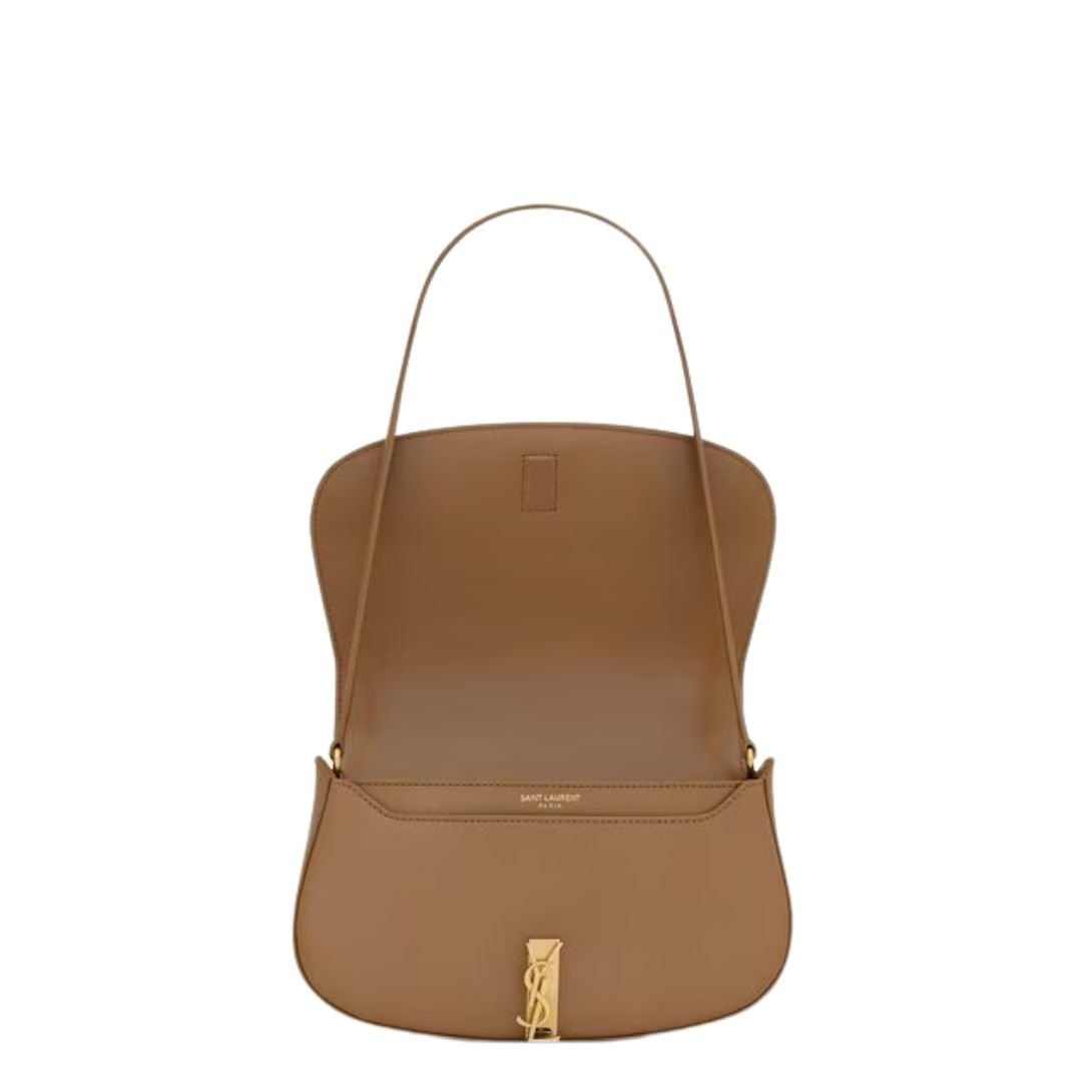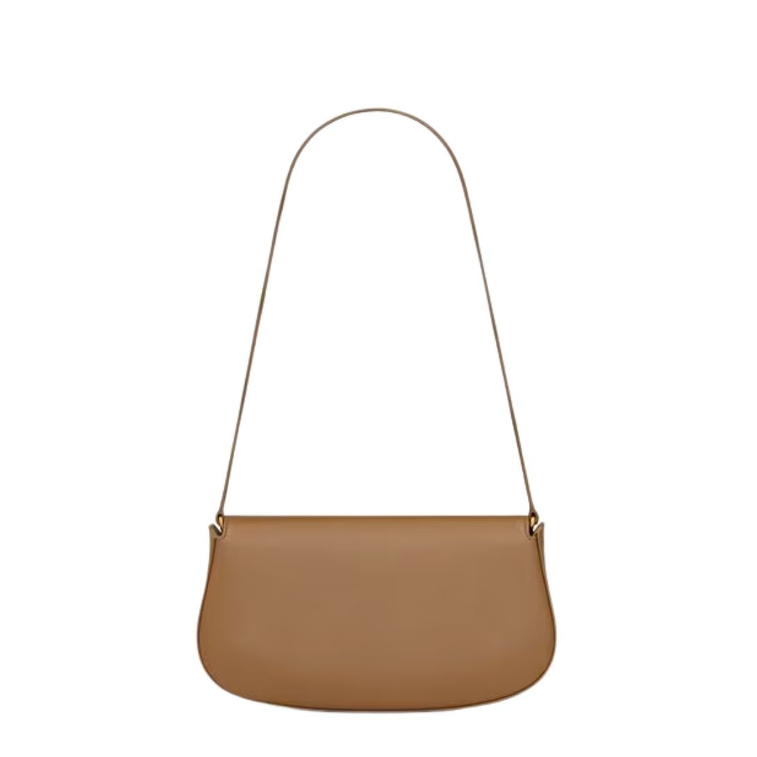 Saint Laurent’s half-moon shoulder bag is a study in modern elegance. Crafted in smooth, gently polished calfskin, its clean crescent silhouette is defined by a structured flap and the house’s iconic Cassandre hinge closure in bronze-toned hardware.