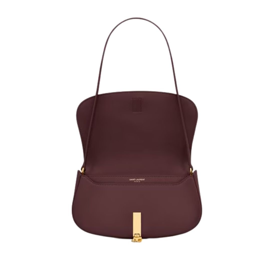 Saint Laurent’s half-moon shoulder bag is a study in modern elegance. Crafted in smooth, gently polished calfskin, its clean crescent silhouette is defined by a structured flap and the house’s iconic Cassandre hinge closure in bronze-toned hardware.