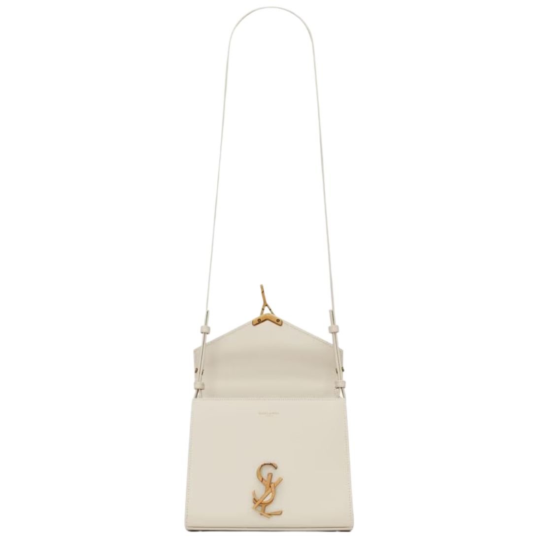 Crafted from chrome-free, metal-free tanned calfskin leather, this Saint Laurent bag merges eco-conscious luxury with signature refinement. Its structured silhouette is defined by a sleek front flap, secured with a pivoting Cassandre metal closure—an iconic accent of the house.