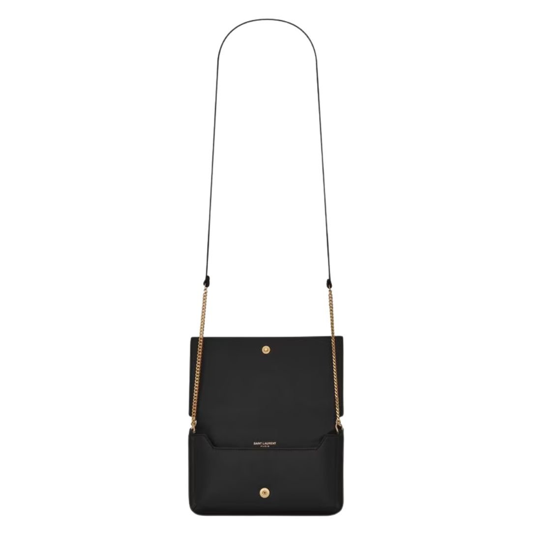 The front flap is elegantly decorated with THE CASSANDRE, adding a timeless designer touch. A distinctive leather and chain shoulder strap adds versatility, allowing the holder to be worn crossbody or on the shoulder for hands-free ease.