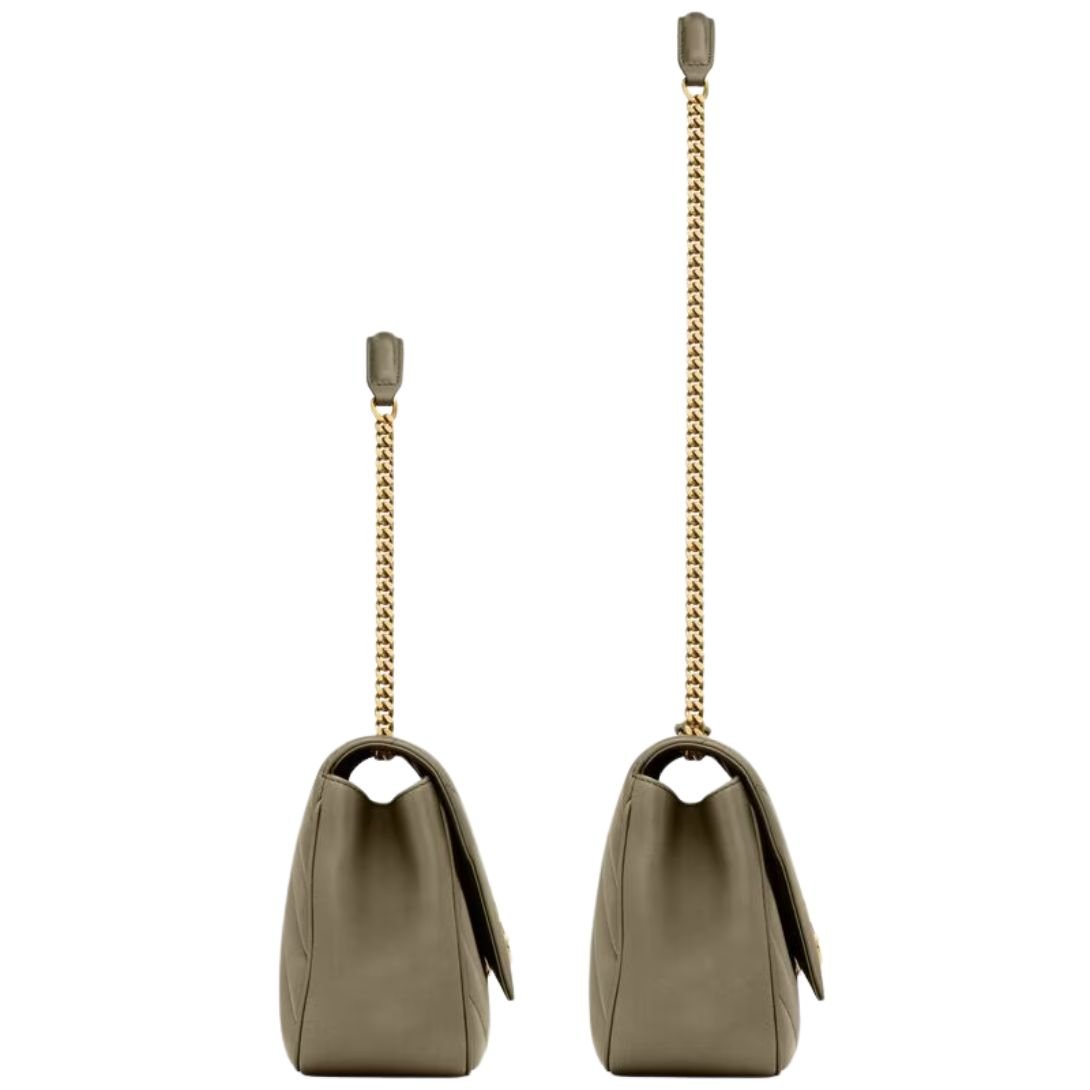 A sliding chain strap allows the bag to be worn crossbody or on the shoulder. Adjust the strap to your preference: 45 cm (17.7″) drop when worn long, or 25 cm (8.7″) when doubled for a shorter carry.