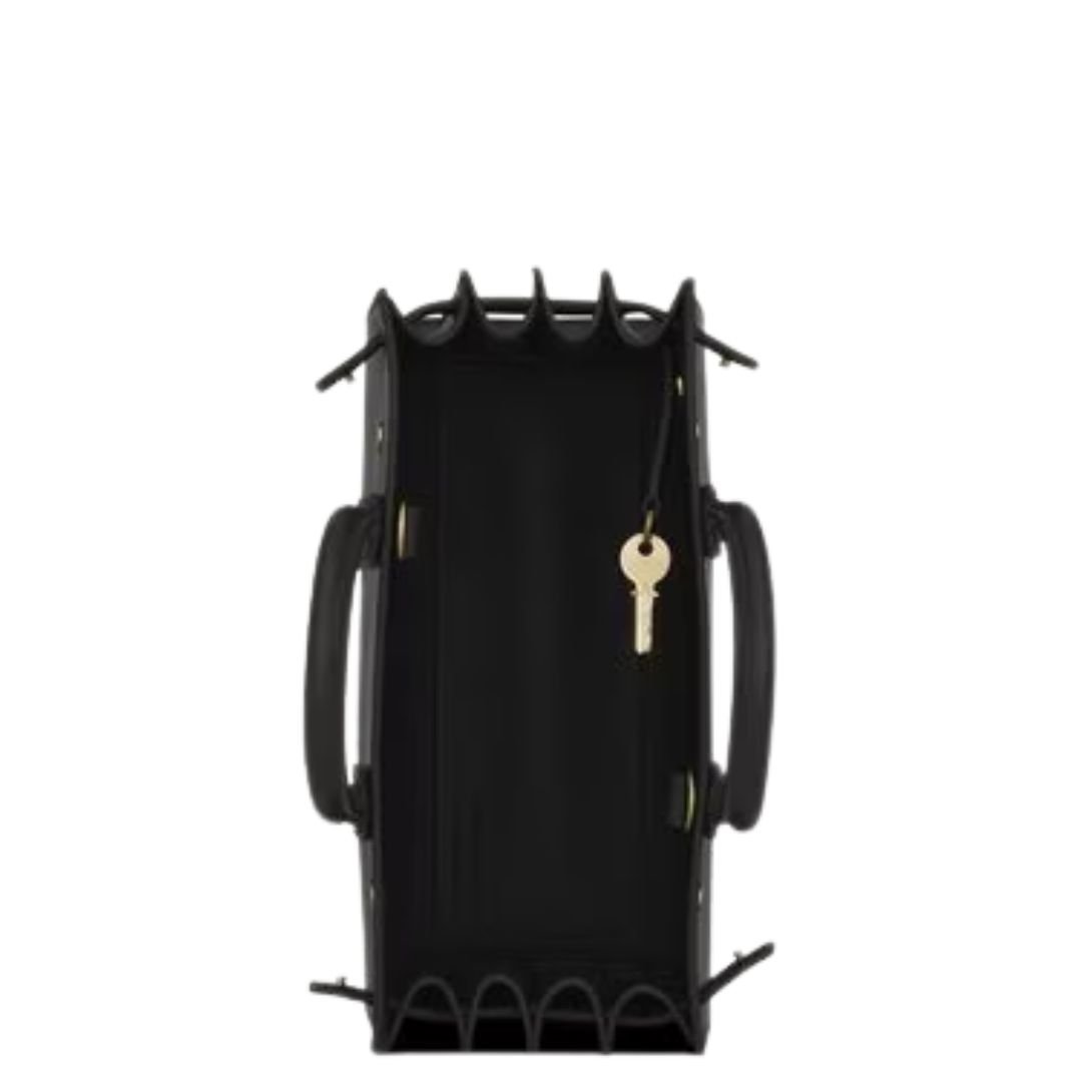 The bag features snap tab closures and accordion-style gussets that allow for a roomy interior despite its compact size. A detachable leather-encased brass padlock adds a signature touch, while five metal feet protect the base for lasting durability.