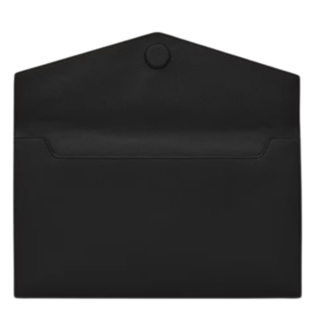 This Saint laurent women’s uptown pouch black small envelope clutch showcases a sleek, structured design with a signature flap adorned by the iconic Cassandre logo. Its refined aesthetic makes it a timeless piece for both day and evening occasions.