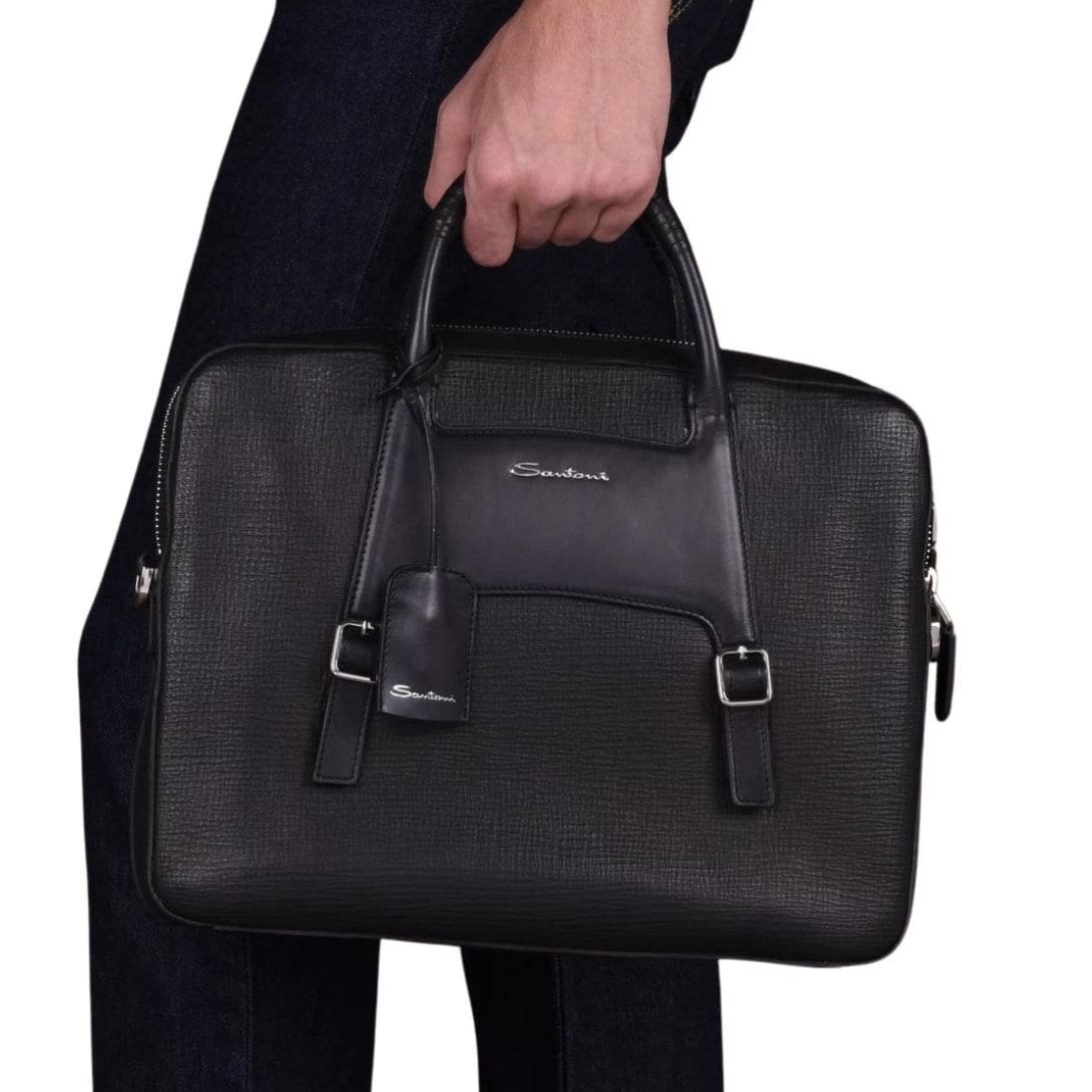 The Santoni Black Embossed Leather Briefcase is a masterpiece of Italian craftsmanship, embodying both luxury and functionality. Designed for the discerning professional, this briefcase is crafted from premium black leather, meticulously embossed to create a distinctive texture that exudes sophistication and elegance. SANTONI BLACK EMBOSSED LEATHER BRIEFCASE