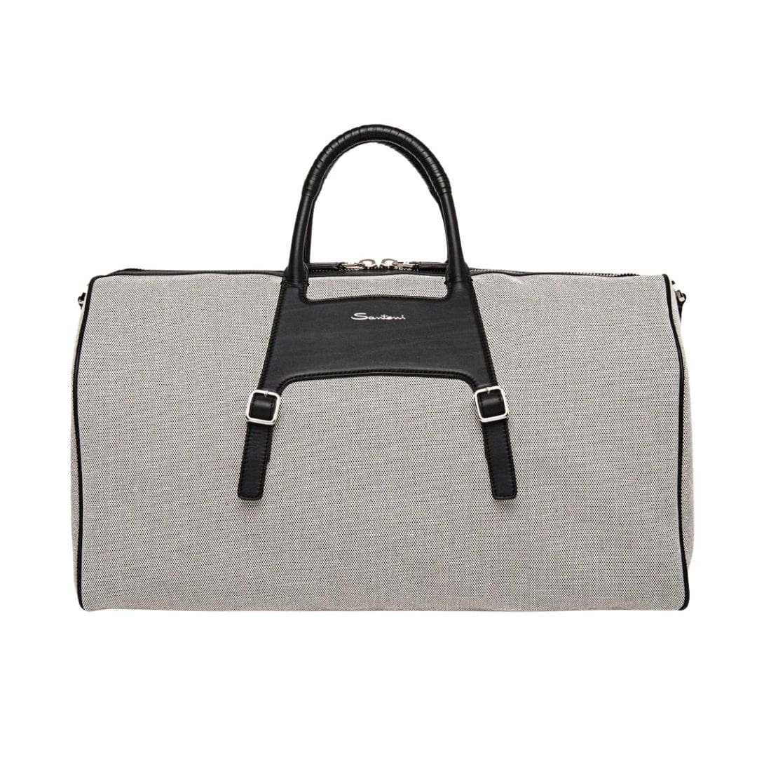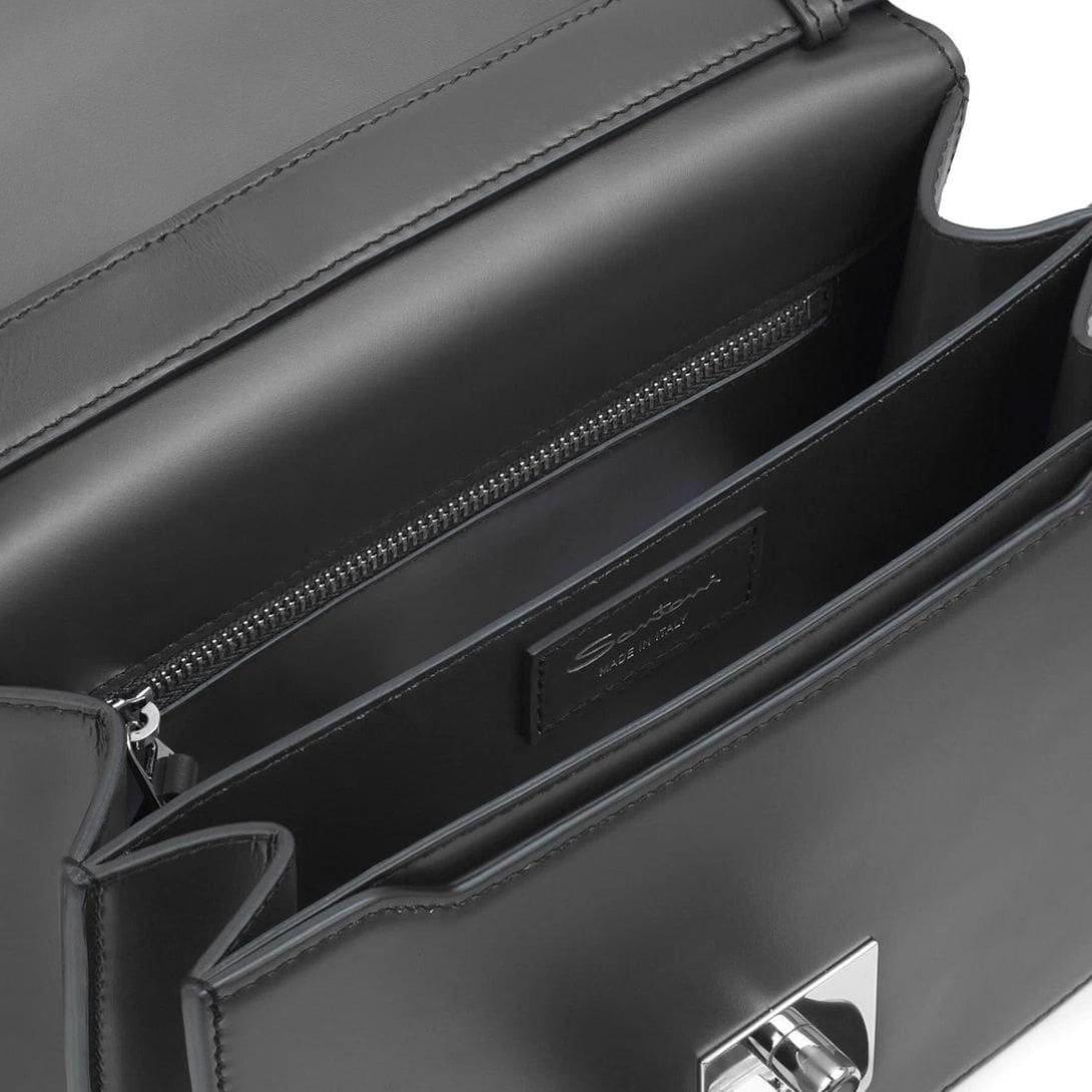 The sleek silhouette of the bag is accentuated by its rich black hue, a color that exudes versatility and refinement. Its minimalist design is adorned with subtle yet distinctive accents, such as the signature Santoni logo discreetly embossed on the front flap, adding a touch of understated glamour.