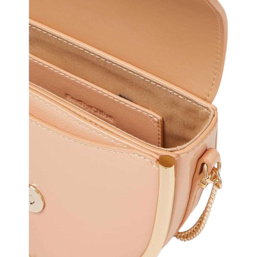 Designed for versatility, it features a chain-linked crossbody strap for hands-free comfort, multiple compartments for organized storage, and an interior slip pocket. Finished with a signature logo charm and soft cotton lining, this clutch is the perfect blend of function and fashion.