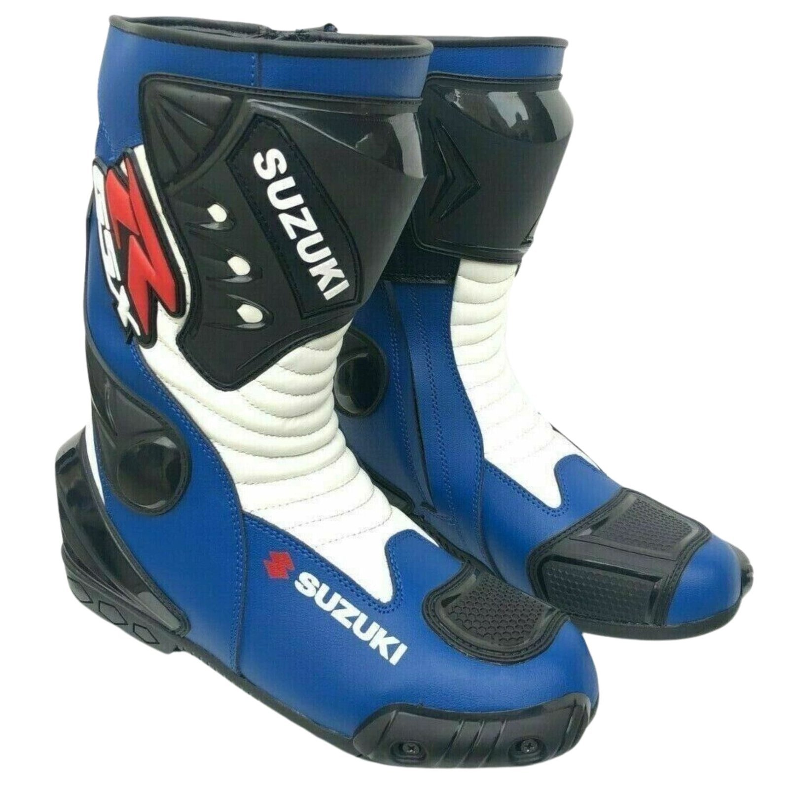 SUZUKI MOTORCYCLE LEATHER BOOTS BLUE, BLACK & WHITE
