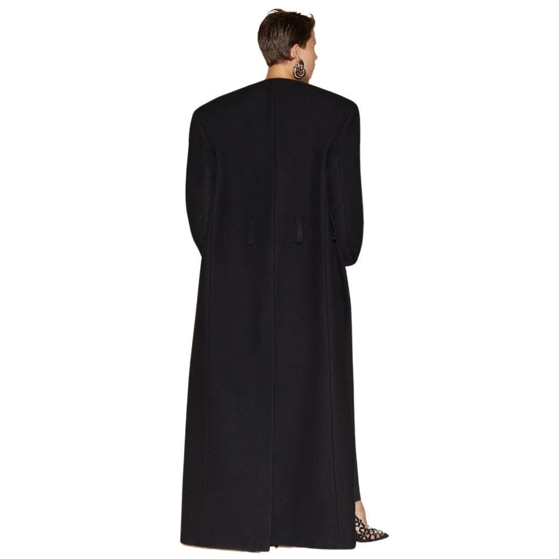 The attico black long coat in wool cloth features a deep V-neck and is single-breasted with one button. Made in Italy.
