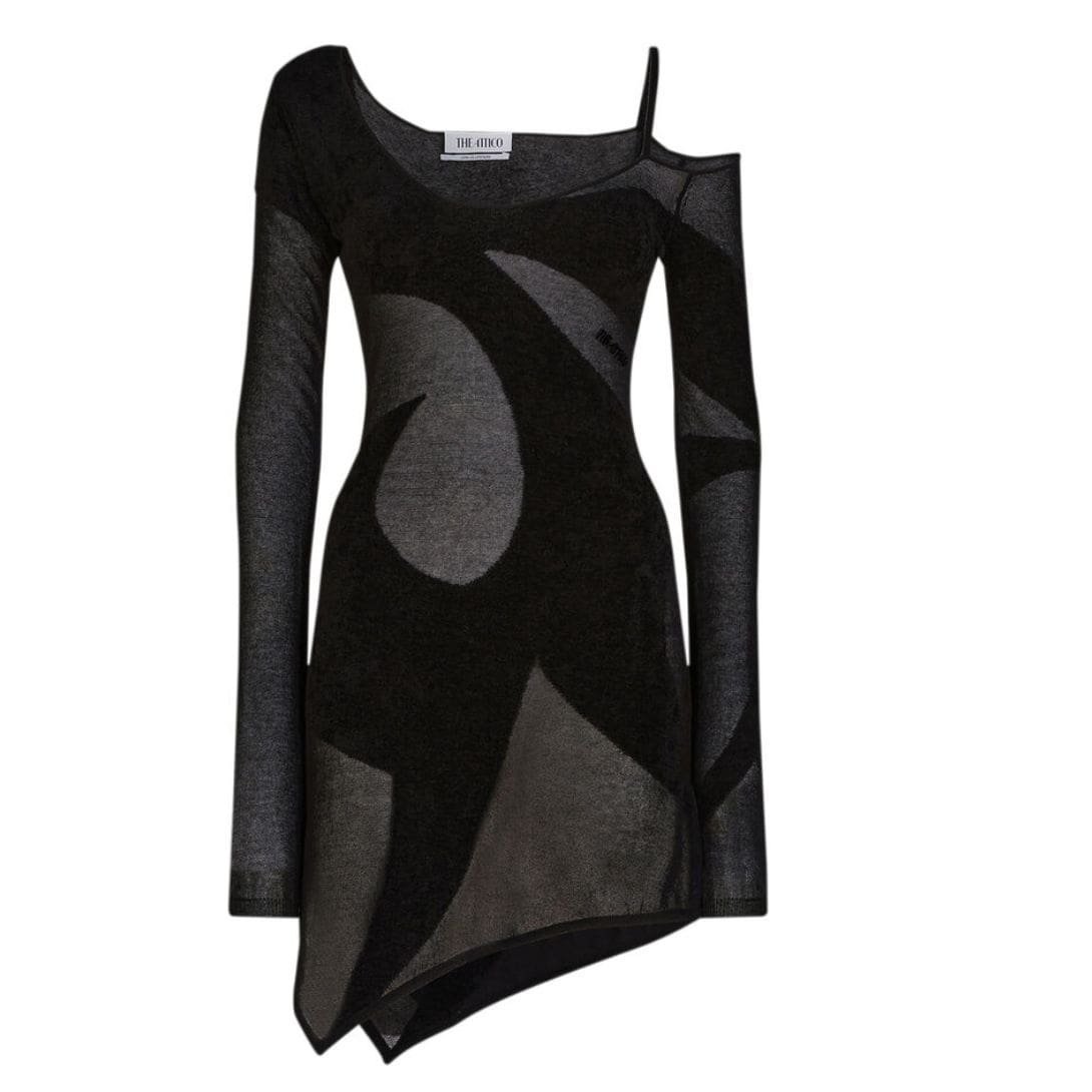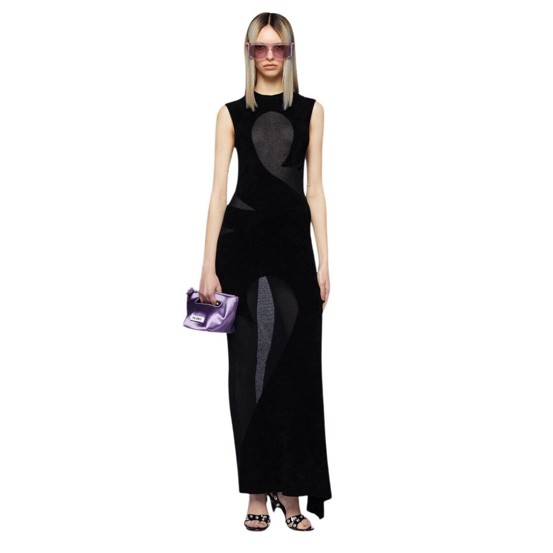 This sleeveless the attico black long dress, expertly crafted in Italy, features black chiffon viscose adorned with a striking macro tribal tattoo design.