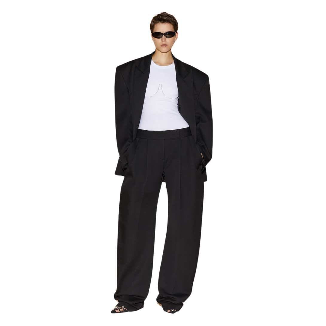 The attico black long pants in pale pink tailoring stretch feature a low rise, wide leg, and logo embroidery. Made in Italy.