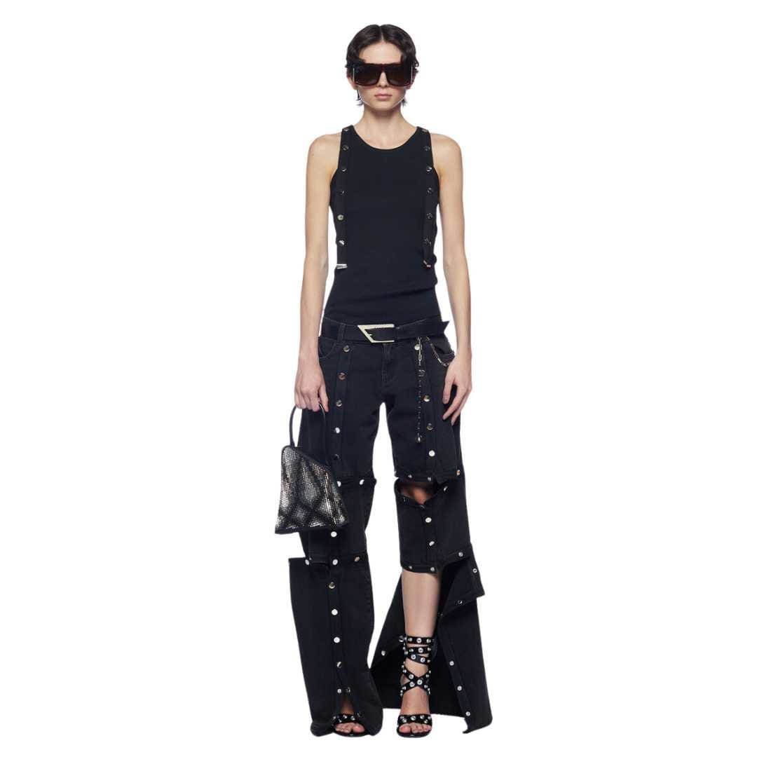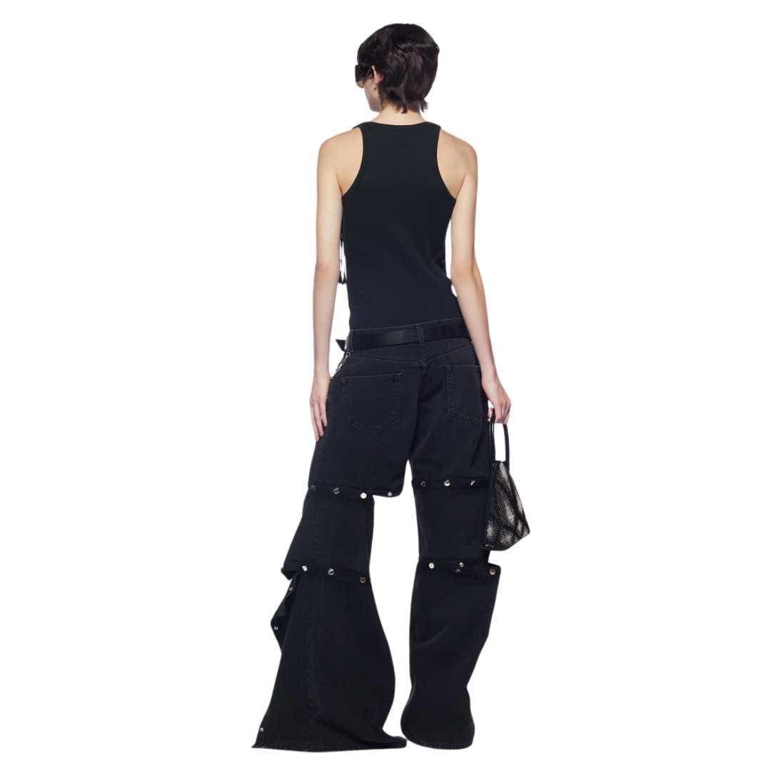The attico black long pants denim feature trim with logo metal snaps, a folded fifth pocket, and an embroidered logo. Made in Italy.