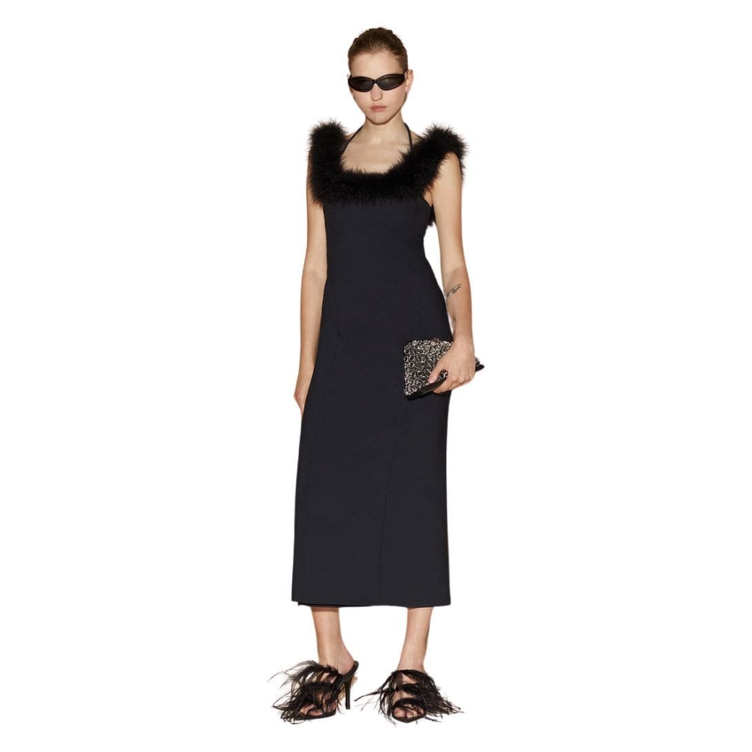 The Attico Black Midi Dress in black crepe stretch with double straps and boa marabou border on the neckline. Crafted in Italy.