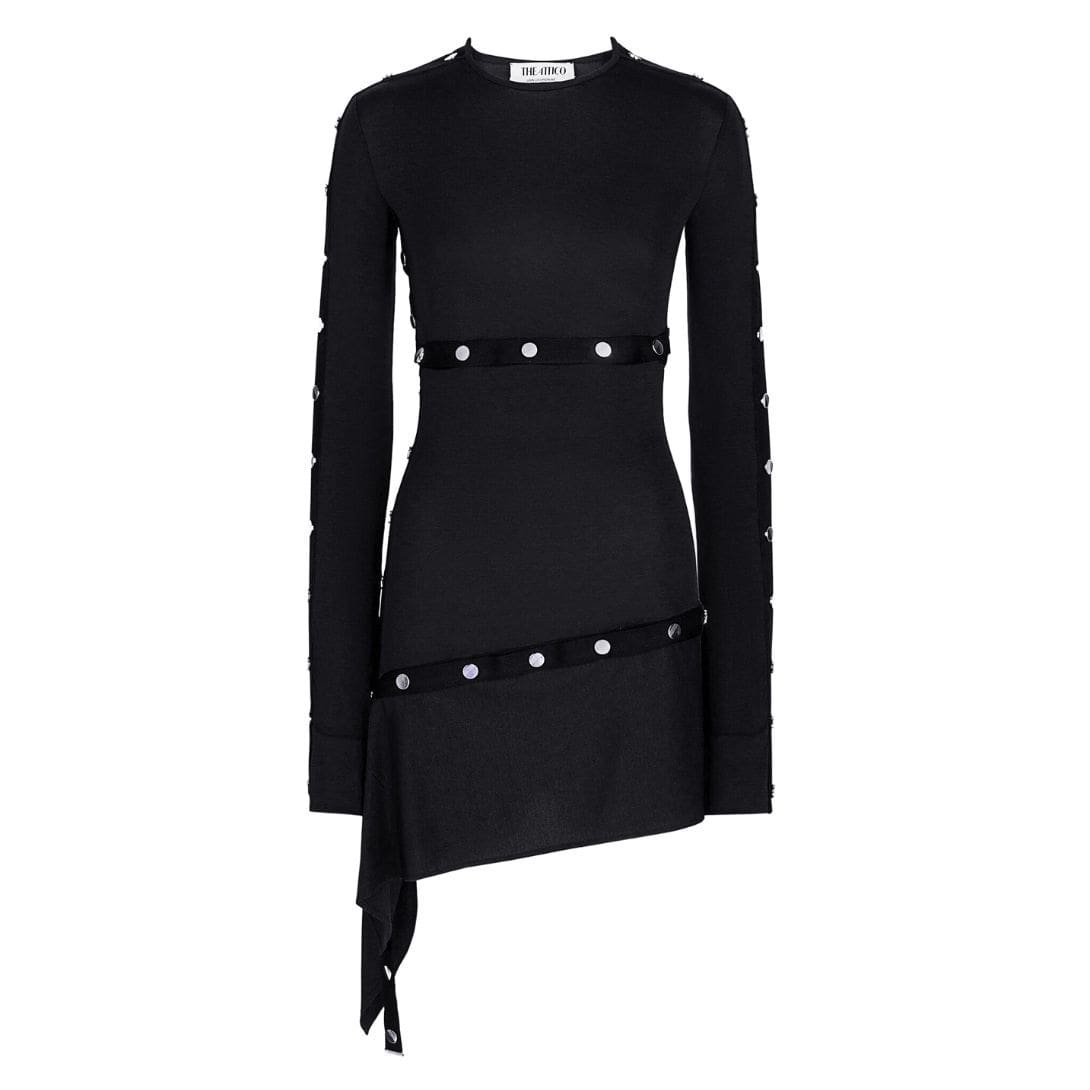 The Attico Black Mini Dress in black stretch jersey with an asymmetrical bottom, trimmed with logo metal snaps and logo metal terminals. Made in Italy.