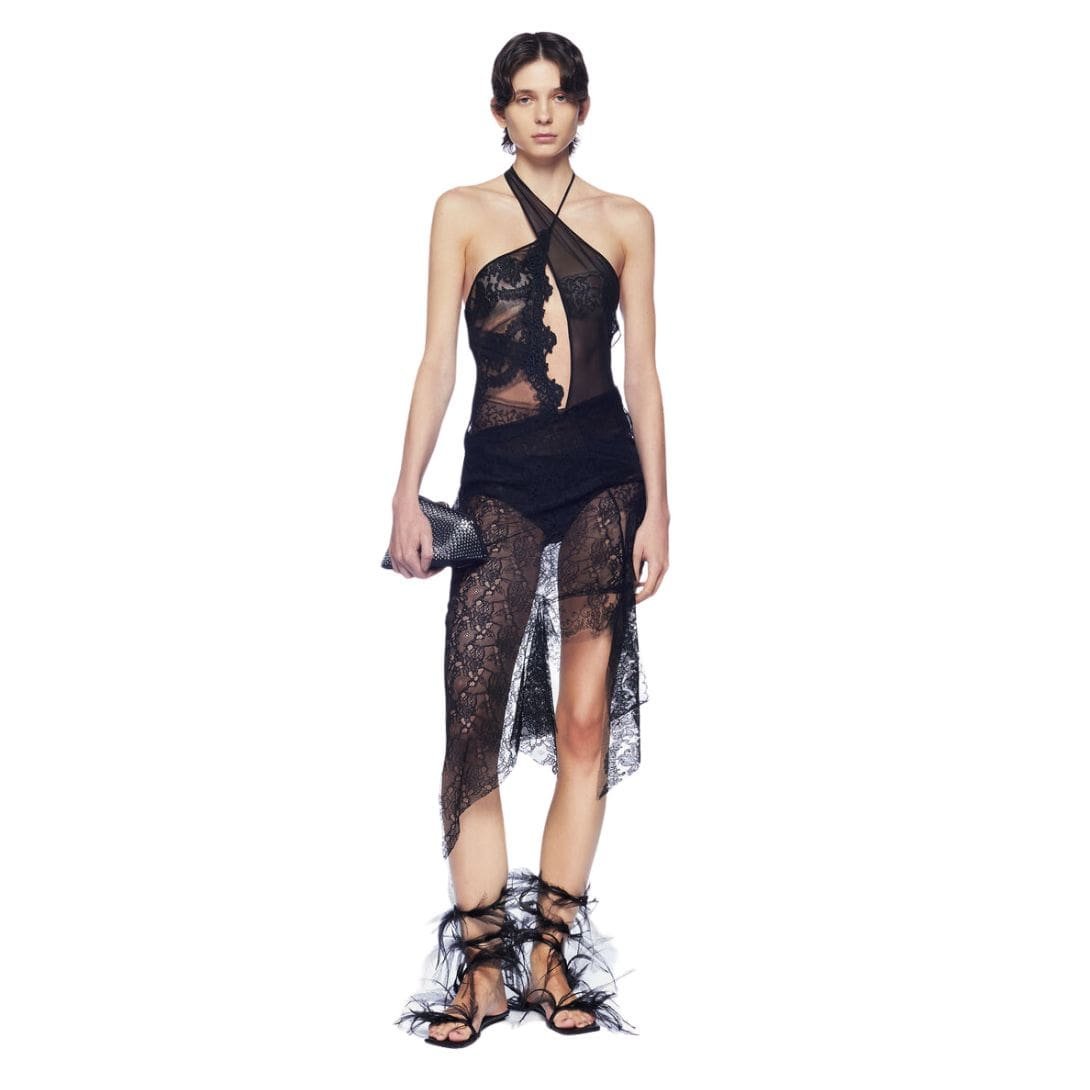 The Attico Black Mini Dress in black light lace with halter neckline, front opening, asymmetrical bottom, and logo metal hook. Made in Italy.