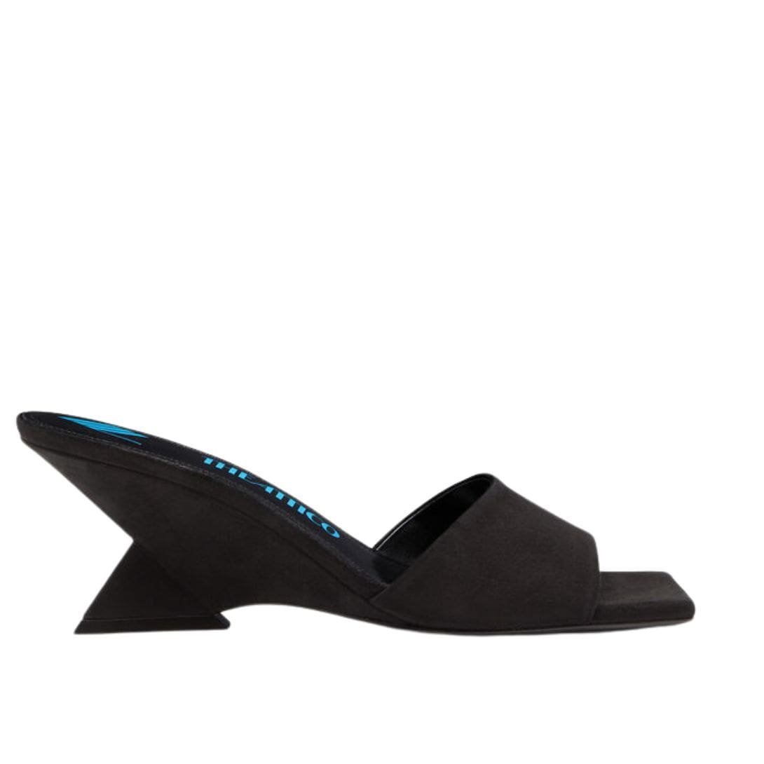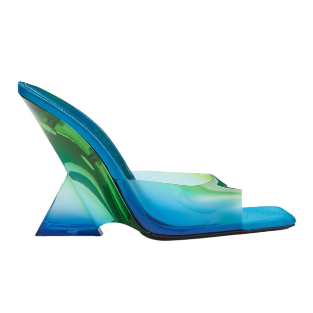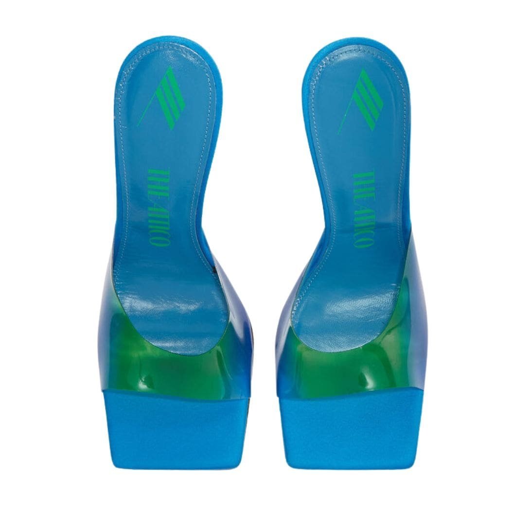 The Attico “cheope” Degradè Blue Mule in degrade blue PVC with matching degrade plexiglass pyramidal wedge, heel height 105mm.