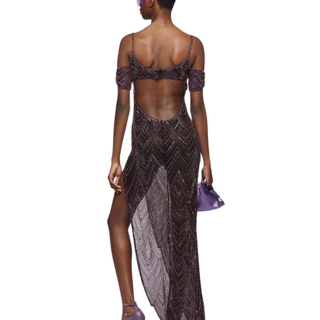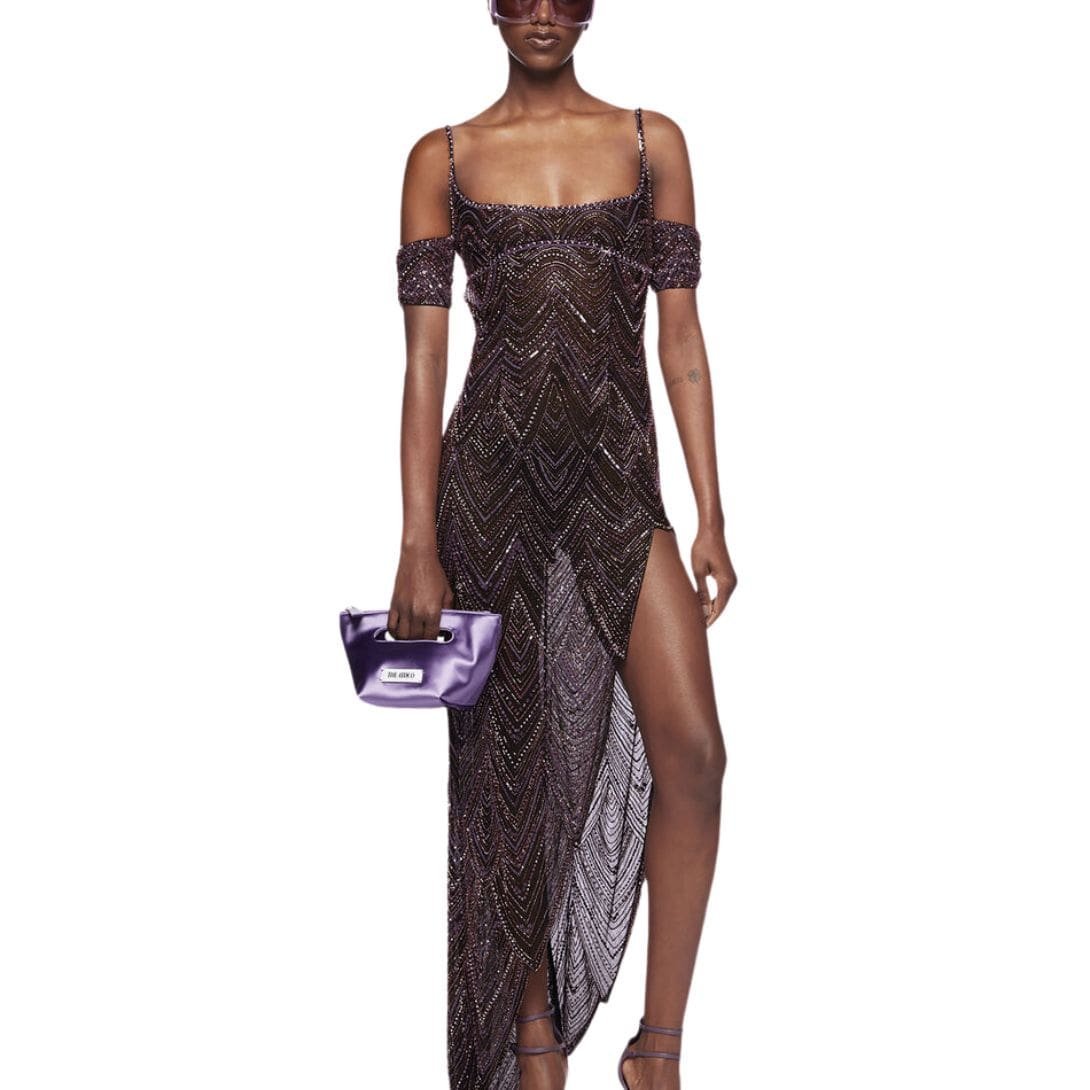 The Attico Dark Purple Long Dress in dark purple gothic embroidery with a double neckline, side slit, and an asymmetrical, fringed bottom. Made in India.