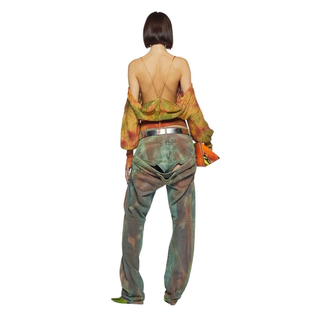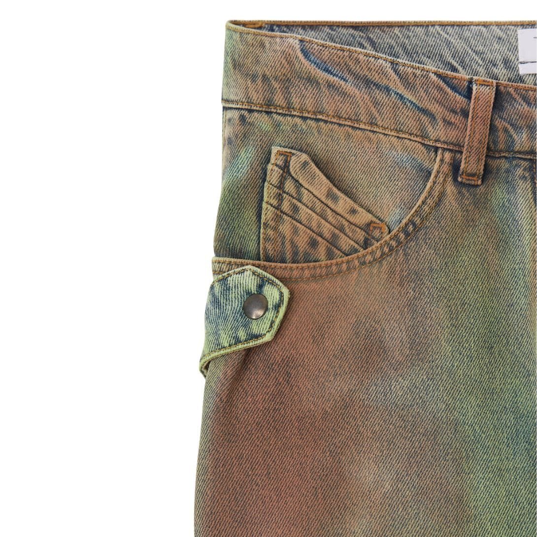 The attico deann camouflage long pants feature a denim design with a double back adorned with buttons and a folded fifth pocket.