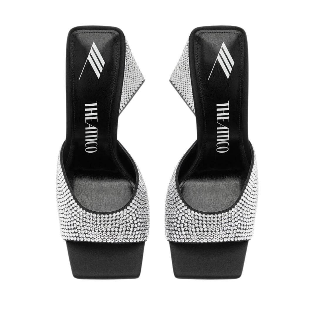 The Attico ”Devon” Silver and Black Mule in black satin with crystal thermoadhesive rhinestones, pyramid heel height 115mm. Made in Italy.