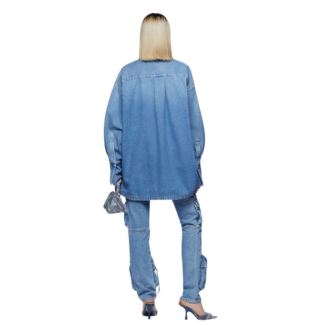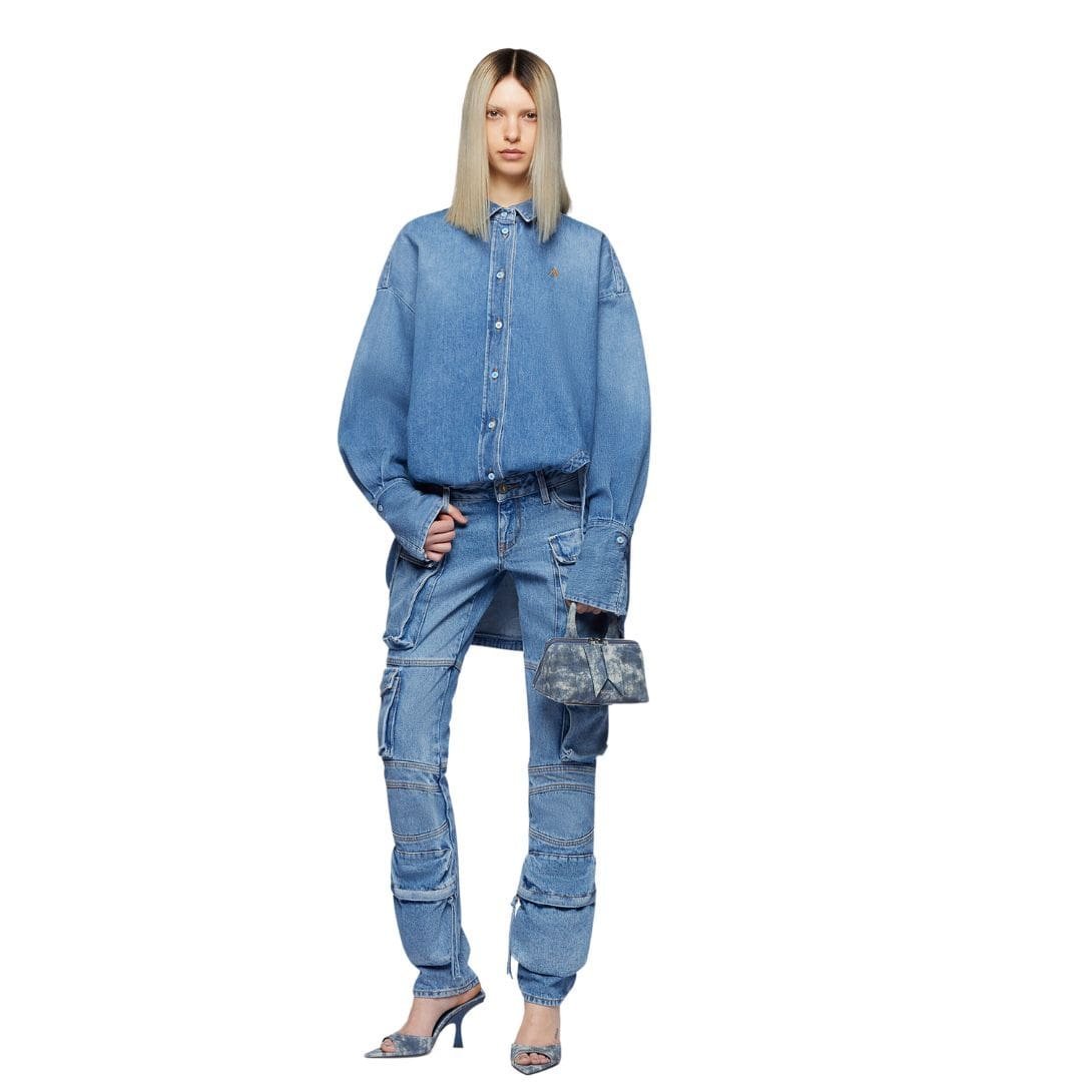 The attico essie washed blue long pants in washed blue denim feature multi-pockets, a low-rise waist, and a folded fifth pocket. Made in Italy.