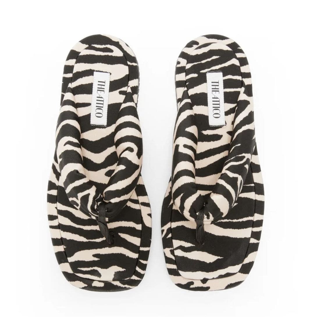 The Attico “indie” Cappuccino and Black Flat Thong, Sandals Are Adorned with A Bold Zebra Print in Red and Milk. Crafted in Italy.