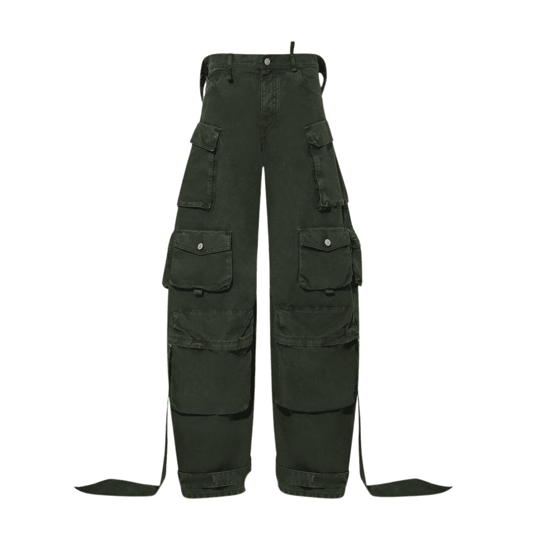 The attico ivy green long pants feature tailoring with multi-pockets, folded fifth pocket, embroidered logo, and cut-out details on the back. Made in Italy.