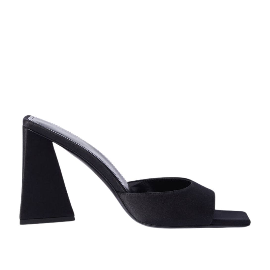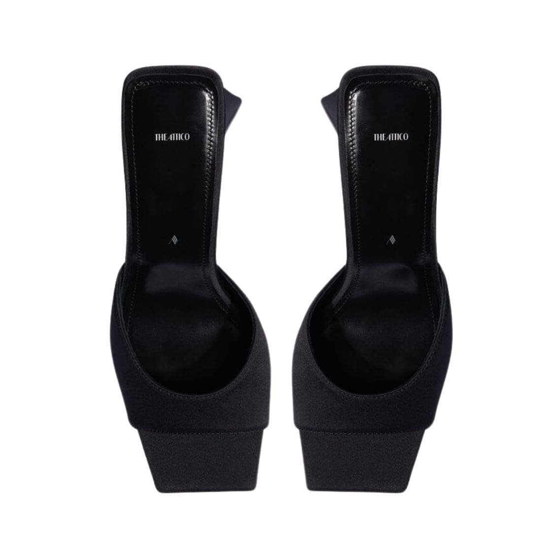 The Attico ‘Mini Devon’ Black Mule in black satin with pyramid heel, height 85mm. Made in Italy.