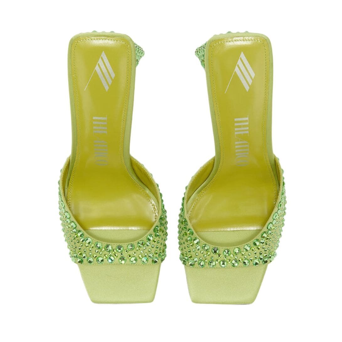 The Attico ”Mini Devon” Lime Mule in lime satin with dégradé hot-fixed strass, pyramid heel, height 85mm. Made in Italy.