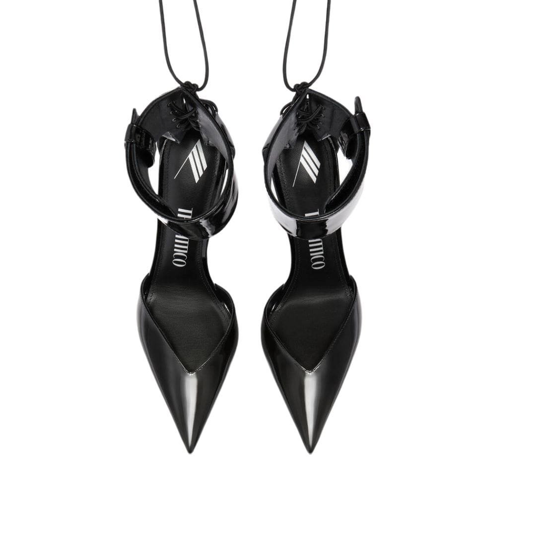 The Attico ”morgan” Black Anklet Pump patent leather with crystal plexy pyramid wedge, heel height 105mm. Made in Italy.
