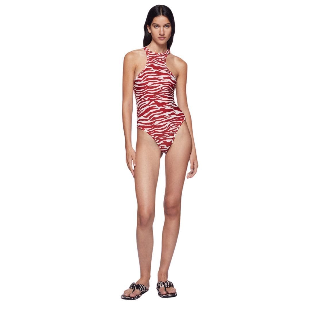 The Attico Red and Milk One Piece Swimsuit Features a Striking Red and Milk Zebra Print with A Logo Metal Hook. Made in Italy.
