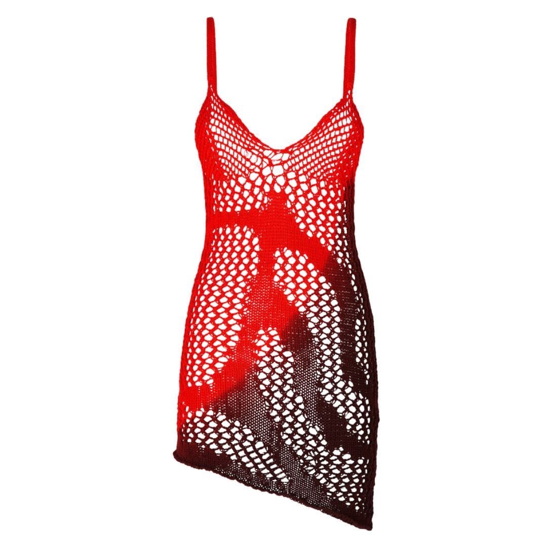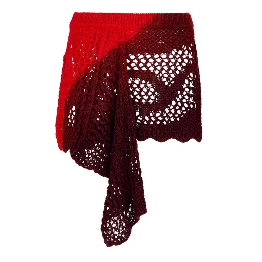 This Italian-made The Attico Red, Fuchsia and Wine Mini Skirt features a unique mis-dyed thick yarn fabric in red, fuchsia, and wine. The design includes a frontal drape and a striking tribal macro pattern.
