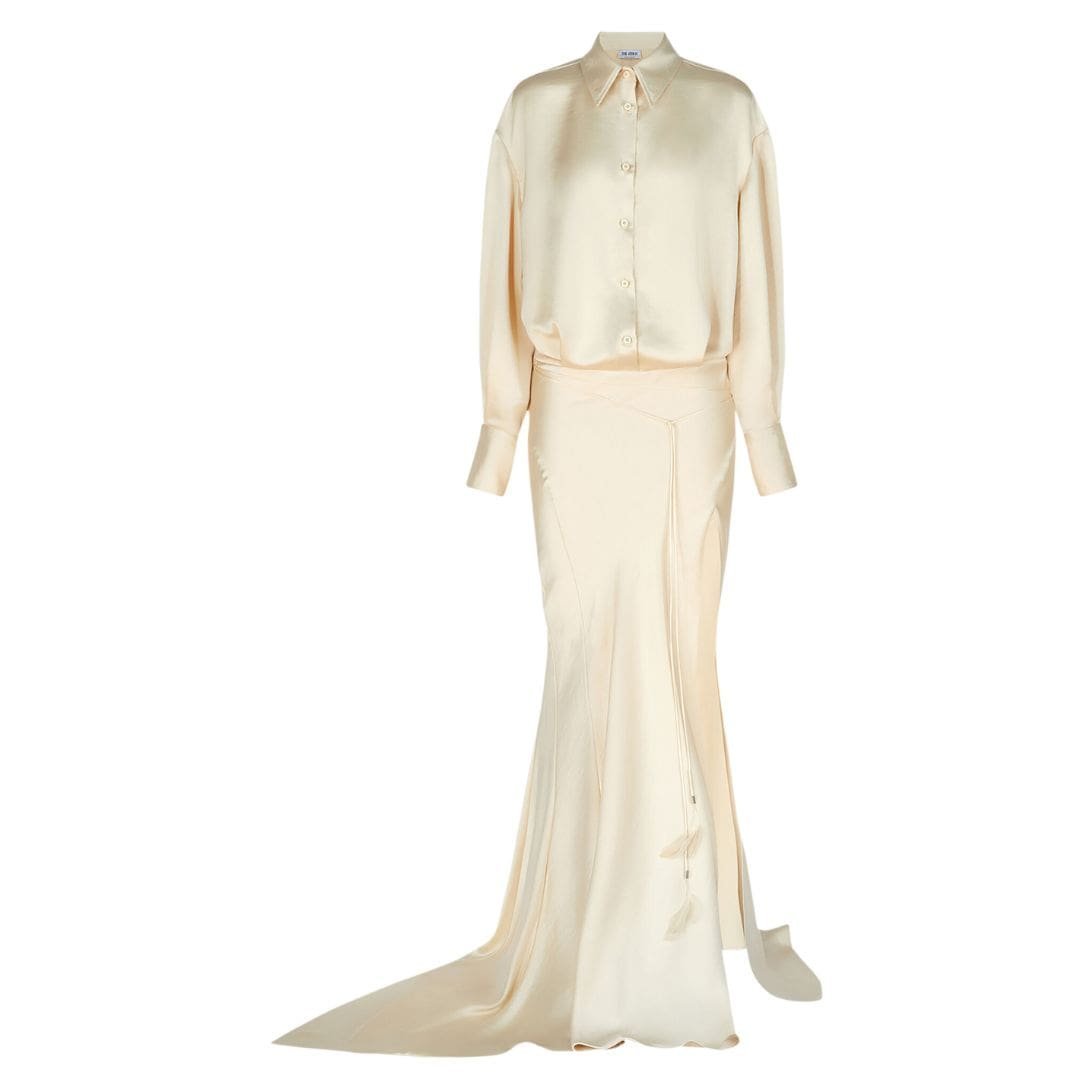 The Attico ”Saskia” White Midi Dress in white double satin featuring a deep neckline, transparent inserts at the bottom, and cylindrical logo metal ends. Made in Italy.